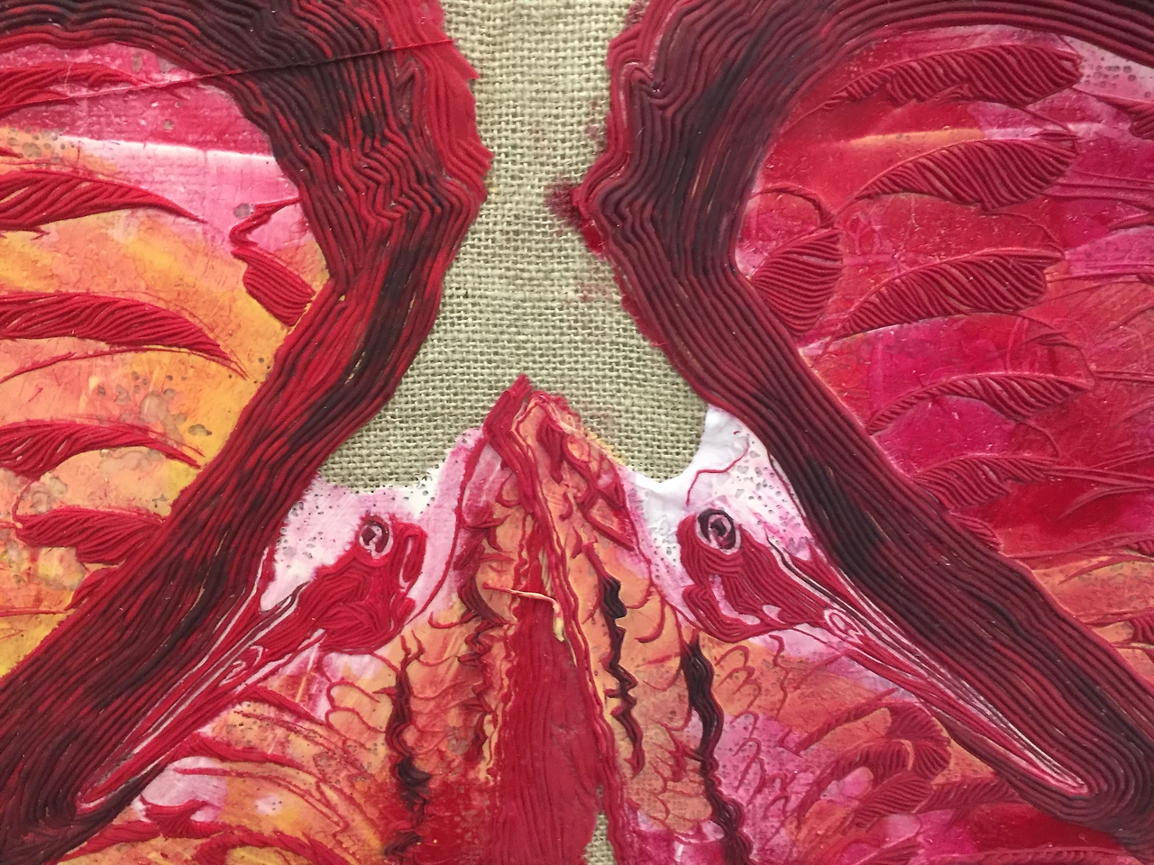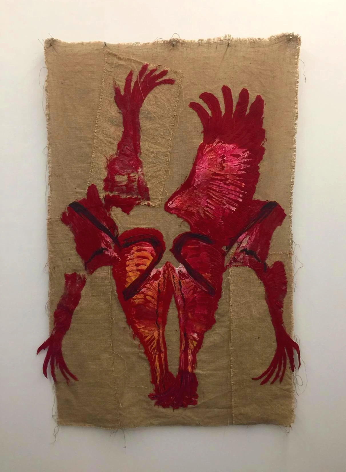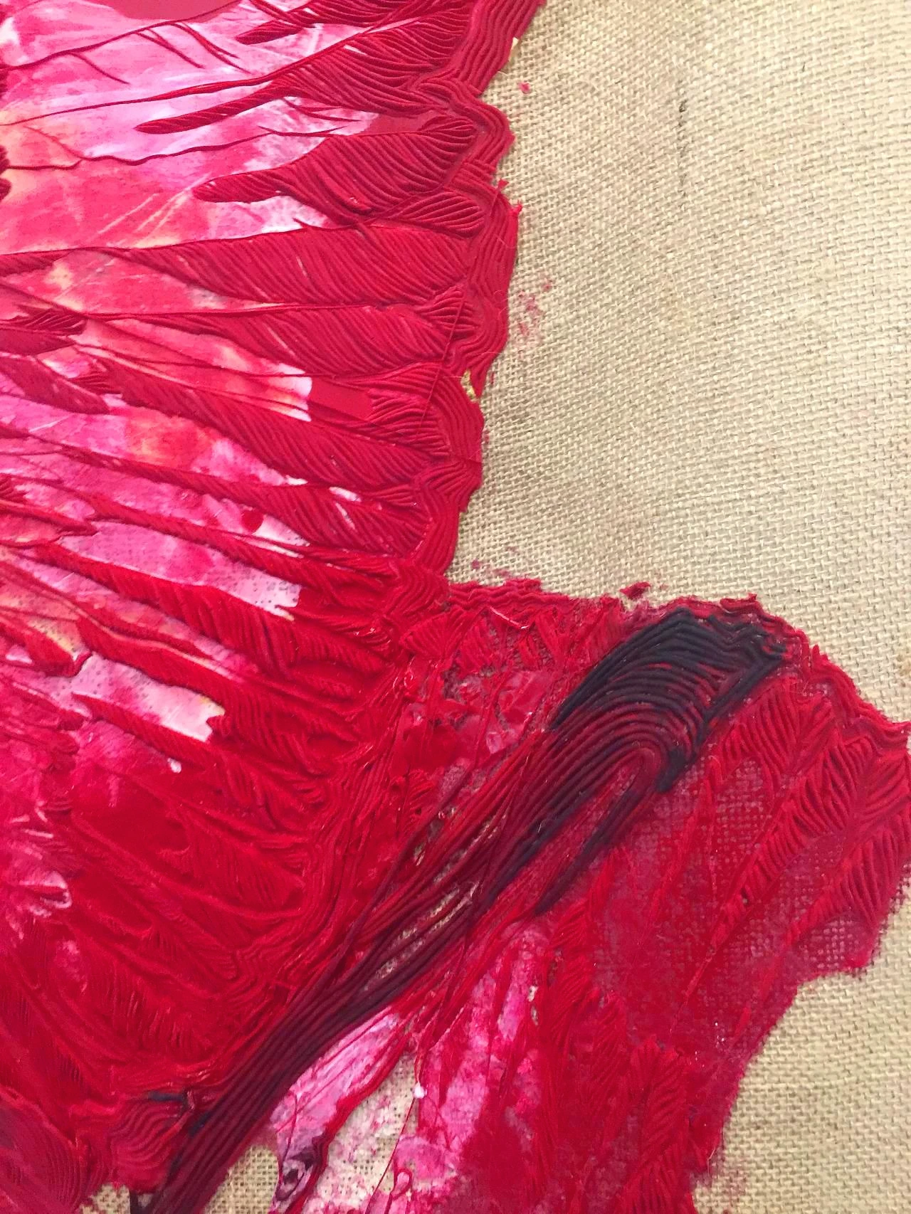 이 작품은 작가가 실리콘을 녹여서 빨강 염료를 섞어서 황색 마 위에 채색한 작품이에요.