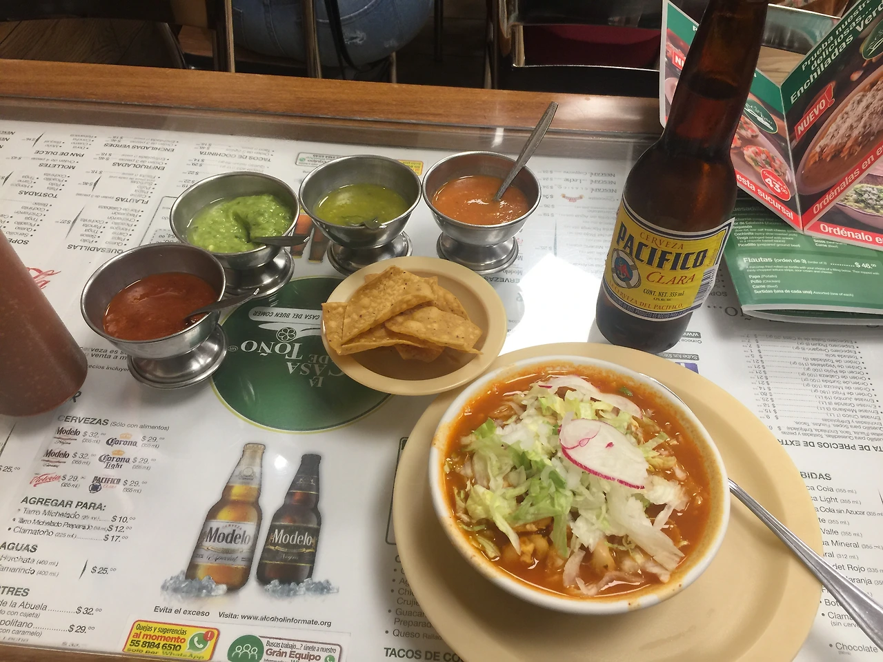 택시를 기다리며 비를 쫄딱 맞은 내 몸에는 한기가 들어있었다. 그런 나를 위로 해준 이 따뜻한 수프. 그리고 울적해진 내 마음에 '바스락' 거리는 식감으로 활기를 불어넣어준 고소 바삭 타코. 고마운 타코. 여기에 초록 빨강 주황의 살사(멕시코에서 먹었던 살사 중 이 날의 살사가 가장 맛있었다.)를 얹어 멕시코 맥주 파시피코 Pacifico와 마시면 멕시코 최고의 '위로 만찬'이 된다.