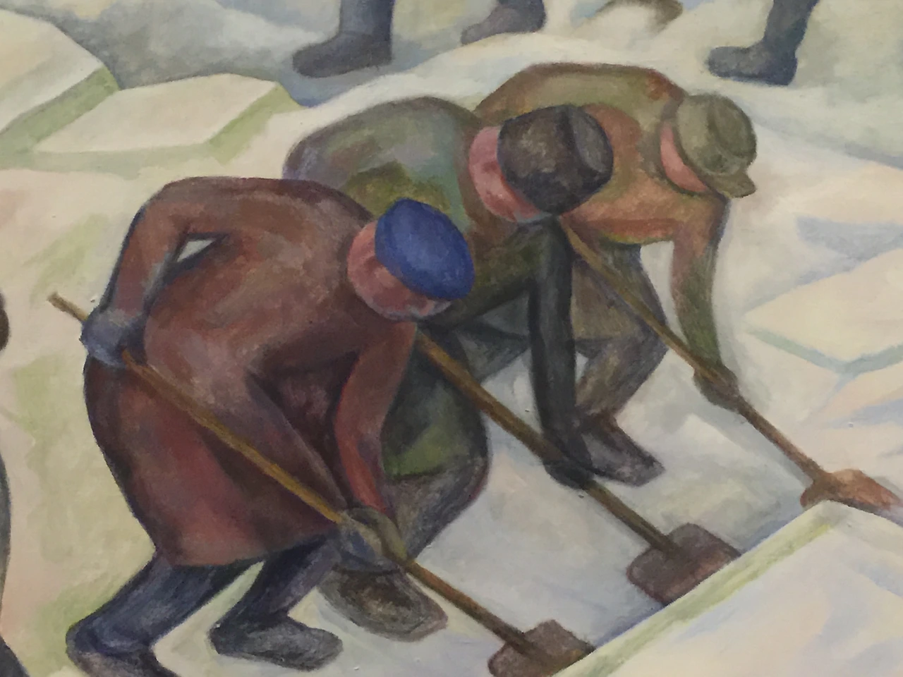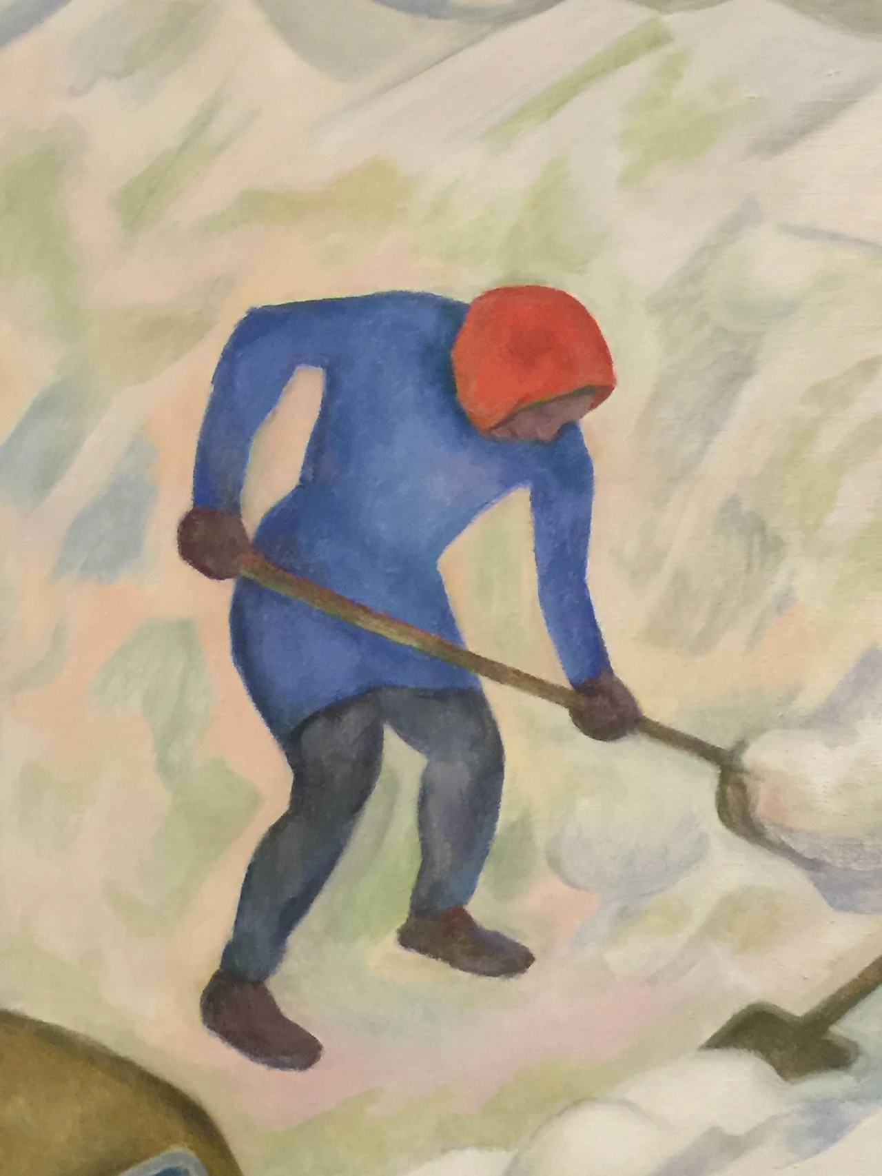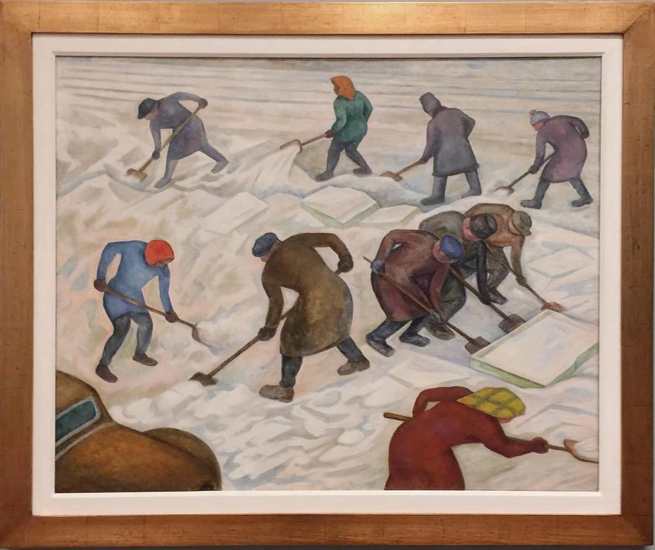눈을 삽질하면서 노동하는 사람들의 모습이 마치 숭고한 의식을 치르는 것과 같이 묘사되어 있다. 마치 밀레가 묘사한 농부들의 모습과 같이.