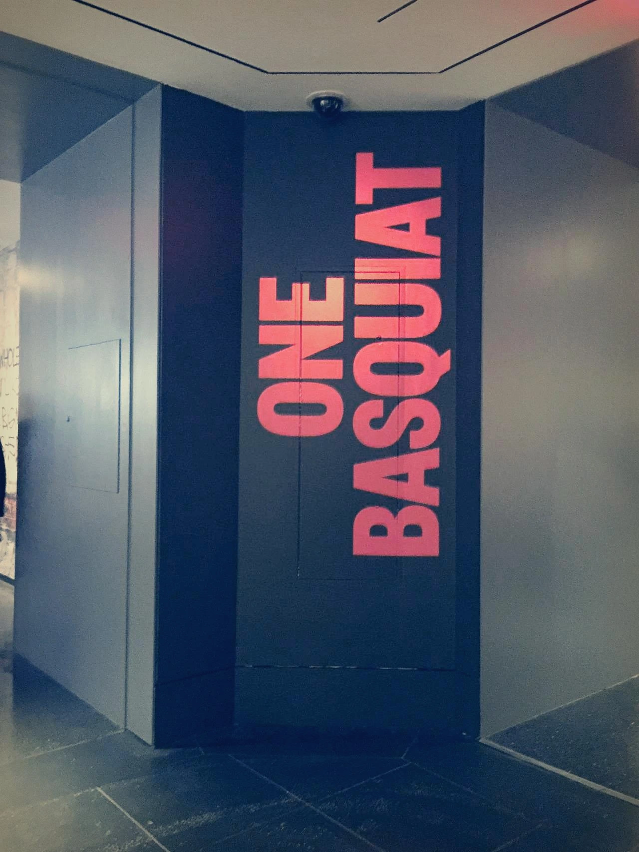 티켓팅을 하고 들어선 전시장 입구에 있던 굵직하고 검은 기둥 위로 핏빛깔의 레이저 빔이 “One Basquiat”라는 전시 제목을 비추고 있었다.