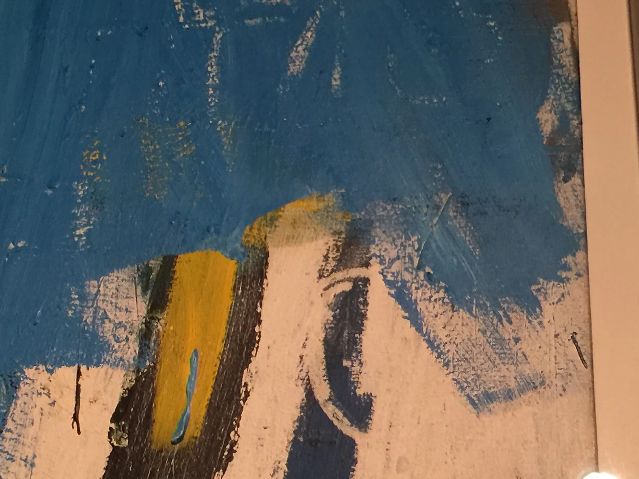 크레파스로 추정되는 매체로 거칠게 스케치된 블랙 스컬 레이어 아래로, 드문드문 보이는 화이트와 그 아래로 레드, 그 곁의 오렌지 컬러까지, 그 형태를 파악하기 어려운 다양한 컬러의 레이어들은 쌓이는 것을 반복하며 그 사이사이로 일부분의 그 모습이 아주 조금 드러날 뿐 그것이 무엇인지 정확히 알 길은 없다.