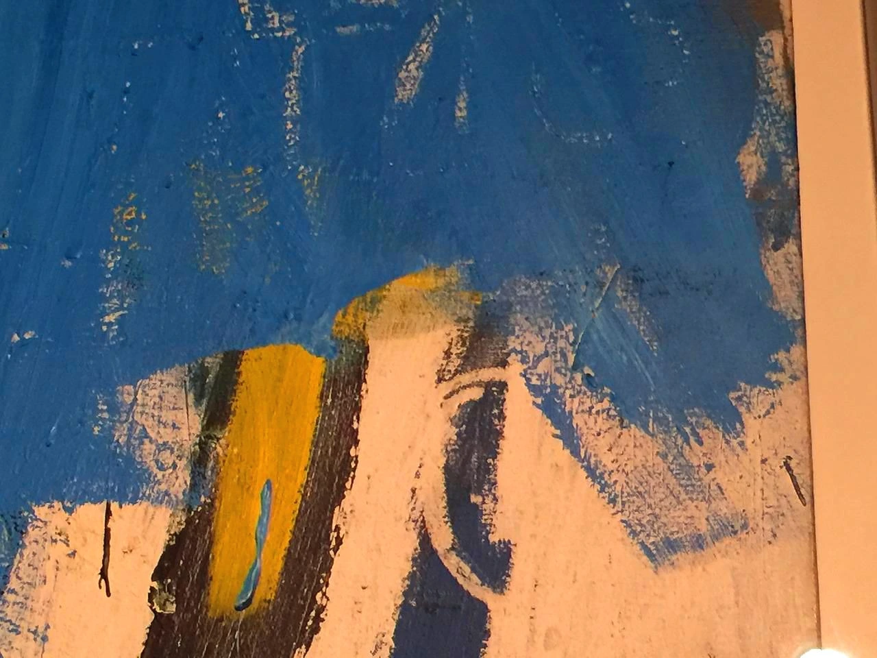 불규칙적이고 투박한 스트록 , 마치 아무렇게나 채색하다가 멈춘 듯 경계가 모호한 푸른 색면, 그리고 그 추상의 색면에 아래로 그 사이로 삐죽하고 튀어나온 이미지들은 수수께끼처럼 일부만이 제시된다.