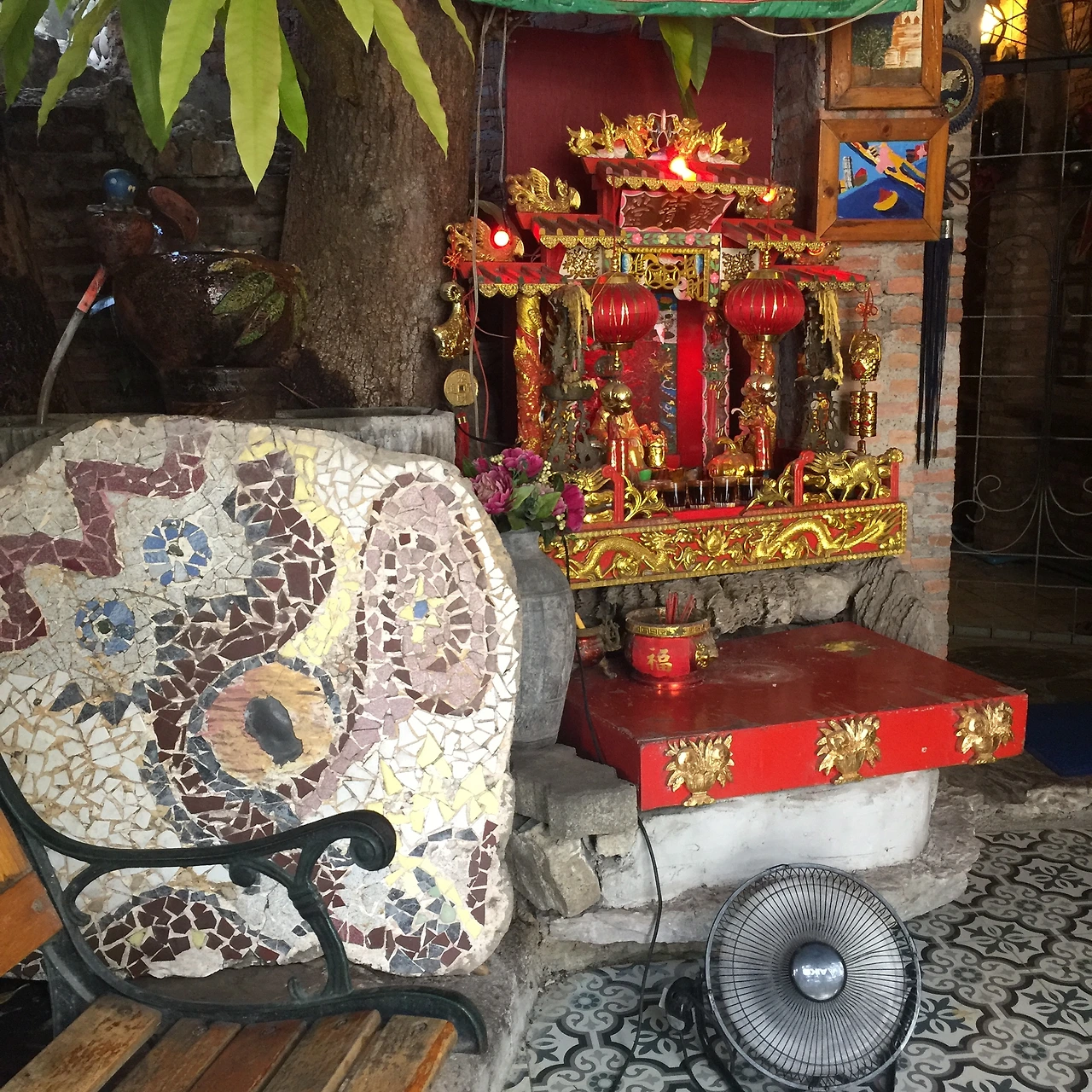 길도, 돈도 잃어 정신없던 내게 따뜻한 카페오레와 크루아상, 시원한 수박까지 내어주시며 그냥 편히 앉아서 먹고 가라며 나를 위로 해준 방콕의 한 카페 사장님. 그분의 호의로, 정녕 절망의 시작인가 하며 의심했던 방콕 여행의 시작은 친절과 따뜻함으로, 그리고 위로로 바뀌었다. 저 벤치에 앉아 맛있게 먹고 마시며 낯선 모자이크 이미지와 사당을 보던 나. 처음엔 너무나도 낯설었던 태국의 문화와 방콕이라는 도시에 대해, 좀 더 깊이 알고 싶다는 생각을 그렇게 했더랬다.