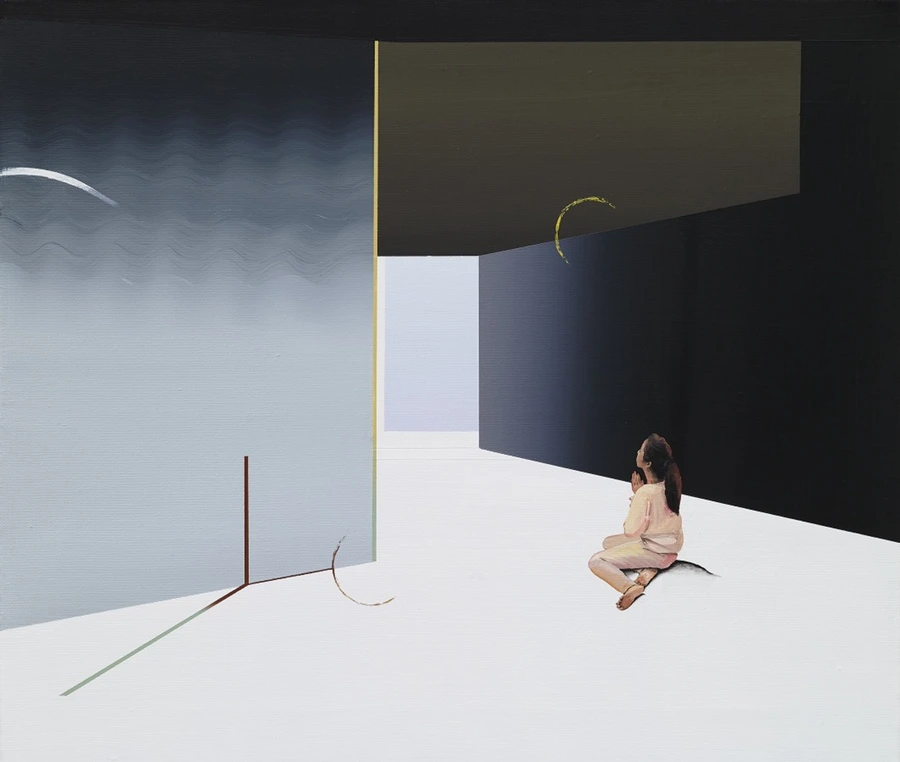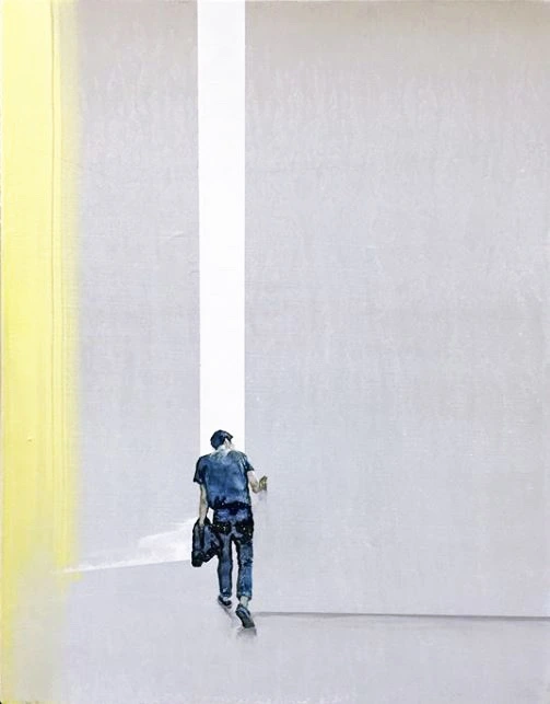 예를 들어 제가 소장하고 있는 작가님의 <모두 잊혀지는 것>은 그레이 색면과 페일 옐로, 화이트를 사용한 색면이 평면을 넘어 뒤로 공간이 있음을 암시하는 듯 인물이 면과 면 사이의 공간으로 진입하려고 하는 장면을 포착한 작품이죠.