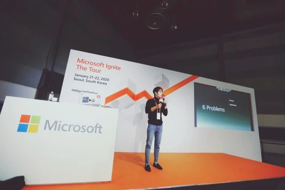 2020 1월, 마이크로소프트 사의 Microsoft Ignite The Tour 행사의 세션으로 참가하여 발표하고 있는 정원석 연구원의 모습
