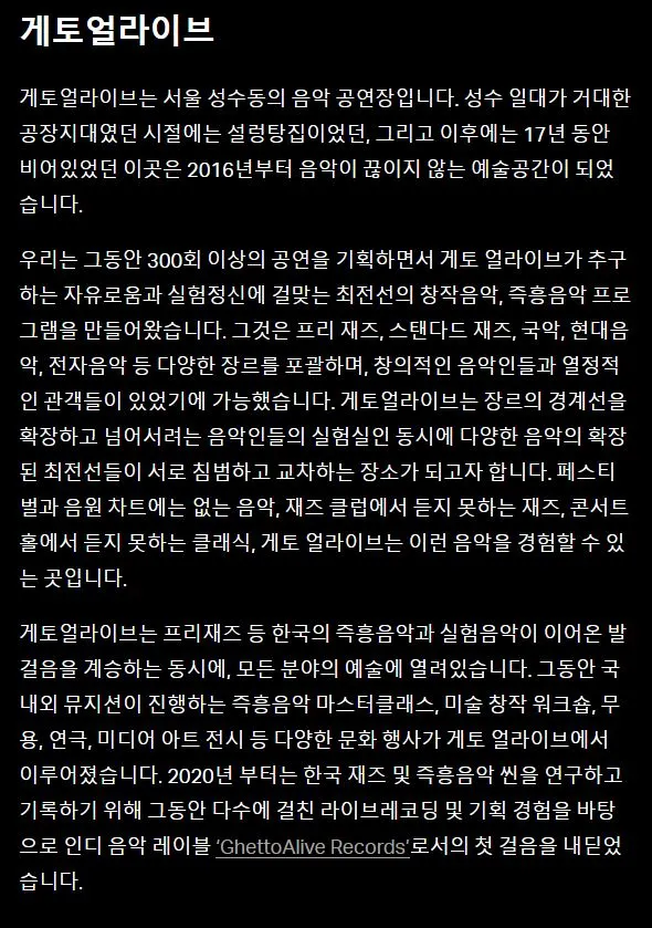 게토 얼라이브(www.ghettoalive.com)는 2016년 처음 개관해서 지금까지 한국 최고의 재즈 뮤지션 & 얼터니티브 사운드 뮤직을 소개하는 중추적인 아트 플랫폼으로 자리 잡아, 지난해 말에는 월간 재즈에서 주목해야 할 재즈 사운드 공간으로 소개되기도 했죠.
