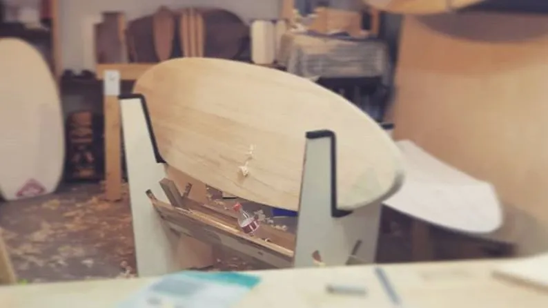 그리고 긴 나무를 사용해 측면 레일을 쌓아 올리고 보드의 윗판(Deck)을 붙입니다. 그 후 보드의 모양을 잡아주는 쉐이핑을 시작합니다. 쉐이핑 이후 표면 마감 후 방수와 강도를 주기 위해 표면을 에폭시 레진으로 코팅합니다. 이런 과정을 거치면 하나의 우든 서프보드가 제작됩니다.