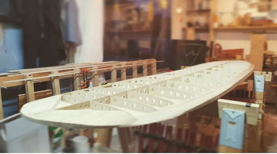 그중 우든 서프보드에 제작 과정을 간단히 설명드리자면, 먼저 제작할 서프보드의 스펙(크기, 쉐입 등)을 정하고 설계를 시작합니다. 그렇게 얻어진 도면으로 뼈대를 제작하고 보드의 아랫판(Bottom)과 붙입니다.