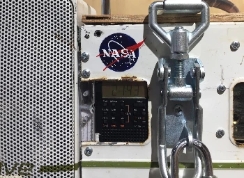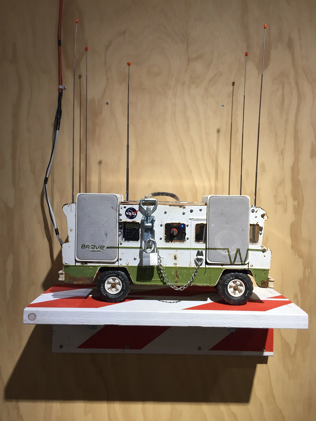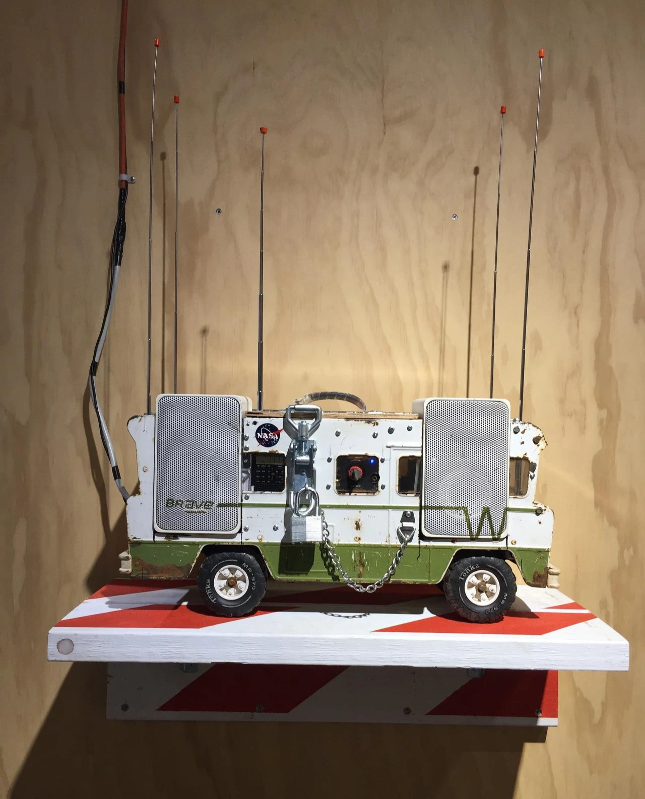 트레일러 미니어처에 삽입된 두 개의 스피커에서는 나른한 재즈 선율이 나오고 있다(영상을 재생하면 들으실 수 있습니다). 측면 창문 위에는 미국 항공 우주 연구소 NASA(National Aeronautics and Space Administration)를 상징하는 로고가 보인다.