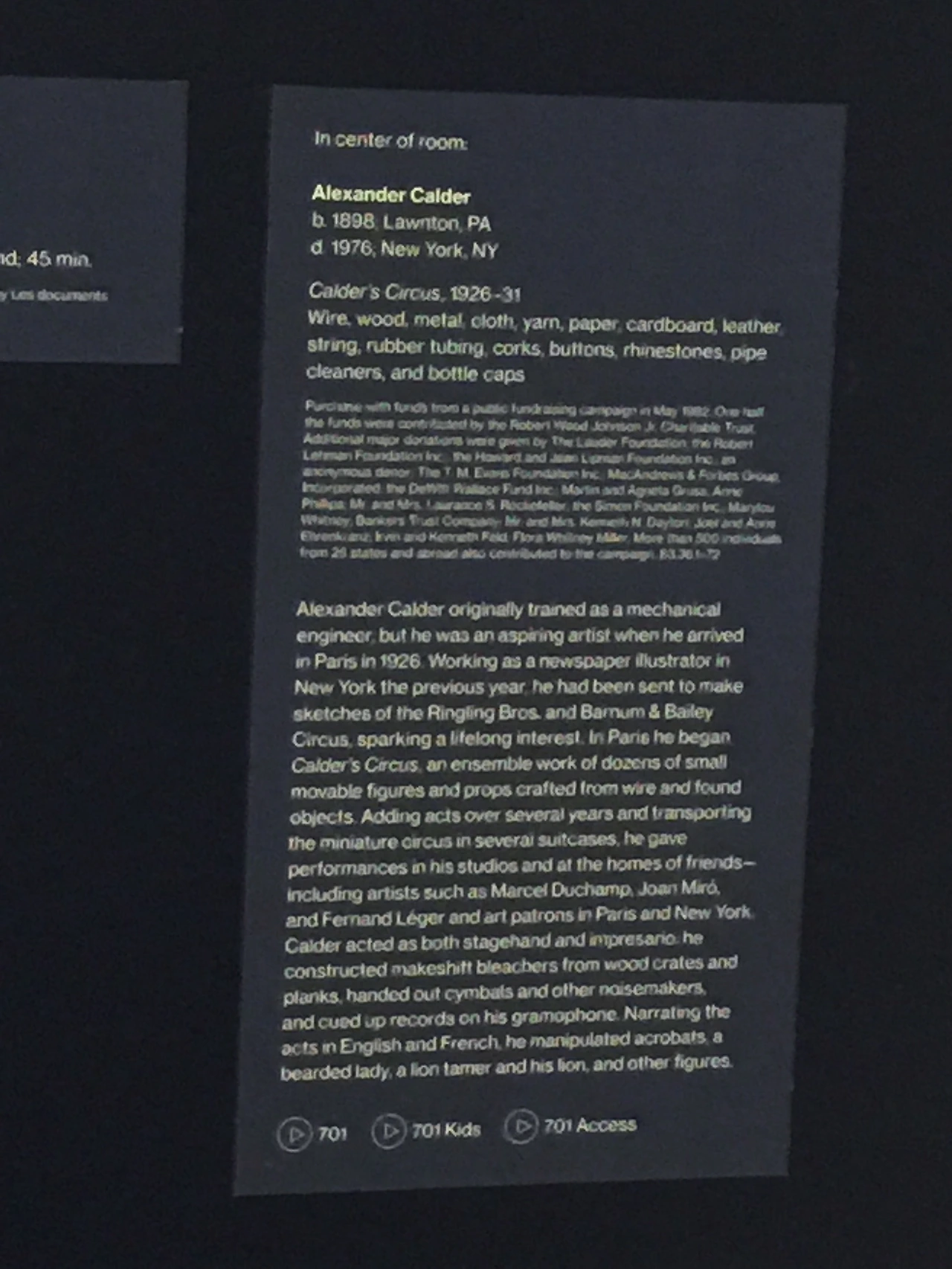 이 흥미로운 남자, 칼더에 대한 이야기를 수집하던 도중, 그의 또 다른 유명한 작품이자, 나도 지난 2015년에 실제로 본 적 있는 작품 하나가 떠올랐다. 알렉산더 칼더의 '서커스(circus)'가 바로 그것이다. 현재 뉴욕 휘트니 미술관에서 소장 중인 이 작품은 칼더가 '이동이 편리한' 서커스 쇼를 보여주기 위해서 만들어진 작품으로, 칼더는 직접 이 이동이 가능한 작은 서커스 키트를 가지고 여기저기 다니면서 직접 공연을 했다니, 정말 이 사람 참 흥미롭다. (칼더가 어린 시절 자신의 여동생에게 장난감이 넉넉하지 않다는 사실을 깨닫고는 이 서커스 키트를 만들 때 사용했던 일상의 흔한 재료, 잡동사니들을 조합해서 직접 장난감을 만들어주었다는 사랑스러운 일화를 듣고 칼더를 다시 보게 되었다.)