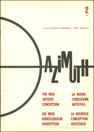 Azimuth의 2번째 발행본의 이미지. "Azimuth"는 동시대 유럽의 주요 미술 운동과는 아주 다른 세계 각국의 전시와 수필에 대한 내용을 주로 다루었다. 본지에서는 엥포르멜의 시작과 쇠퇴, 그리고 Robert Rauschenberg, Jasper Johns, Yves Klein, Lucio Fontana와 같은 새로운 미술 언어를 보여주는 미국 및 유럽권 아티스트의 작품을 이탈리아 미술계에 일찍이 소개했다는 점에서 그 의의가 크다.