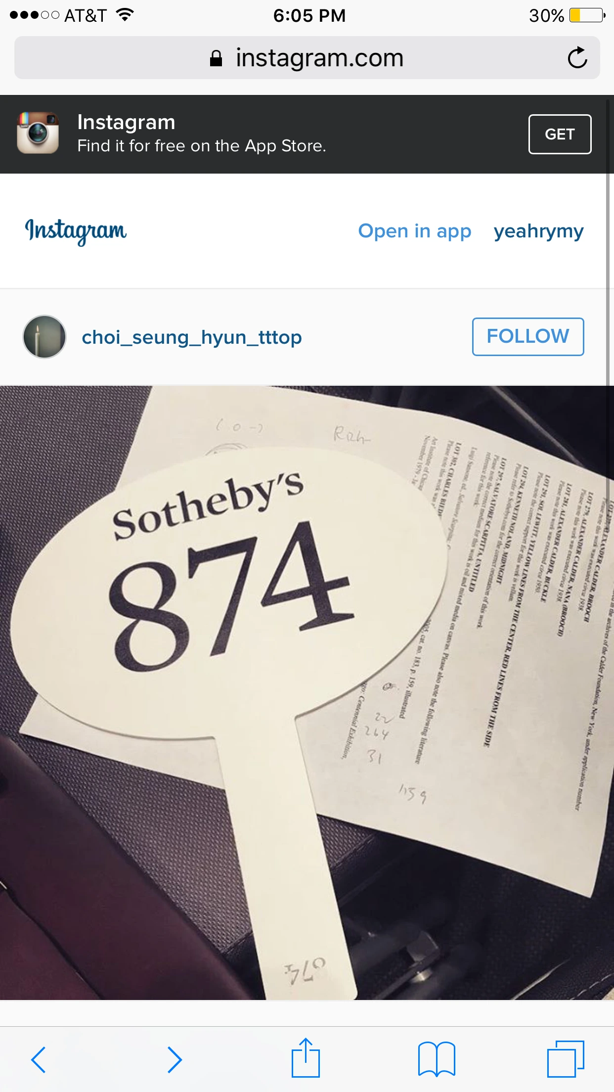 사실 저 프리뷰 전시를 보러 소더비 갔을 때는 11월 11일 오전이었는데, Fontana의 작품이 출품되었던 그날 저녁 경매에서 빅뱅의 탑이 응찰을 했다는 사실을 알게 되었다. 프라이빗 경매로 진행되는 소더비의 이브닝 경매에 나는 소더비 멤버가 아닌 관계로 들어가지 못했다. 그래서 조금 아쉬웠지만 다음날 아침 10시부터 진행되는 공개 경매에 참석했다. 내 옆에 앉은 시끄러운 미국 아저씨가 앉은자리에서 워홀 초기 회화 작품(샤넬, 코카콜라, 디즈니, 애플 등의 이미지를 그린 약 20호 크기의 회화 시리즈 작업)을 3-4점 바로 사는 모습이 매우 놀라웠던 기억이 난다. 1점에 30~40억 원 정도 하는 작품이었다. 하하. 미국은 참 큰 나라다. 그래서 콜렉터도 참 통이 크다 싶었다. 경매 현장을 경험하고 싶다면, 사전에 프라이빗 세일 private sale 여부를 꼭 확인해야 한다.