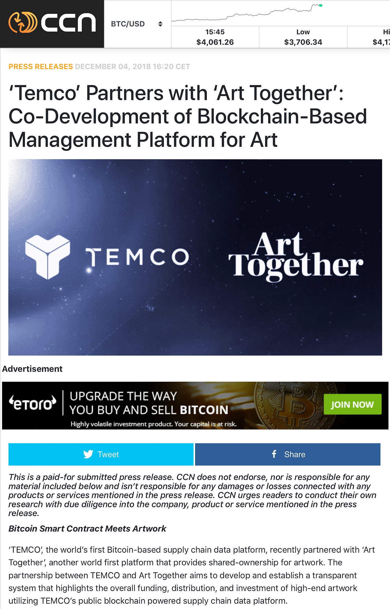 ‘Temco’ Partners with ‘Art Together’: Co-Development of Blockchain-Based Management Platform for Art This is a paid-for submitted press release. CCN does not endorse, nor is responsible for any material included below and isn’t responsible for any damages or losses connected with any products or services mentioned in the