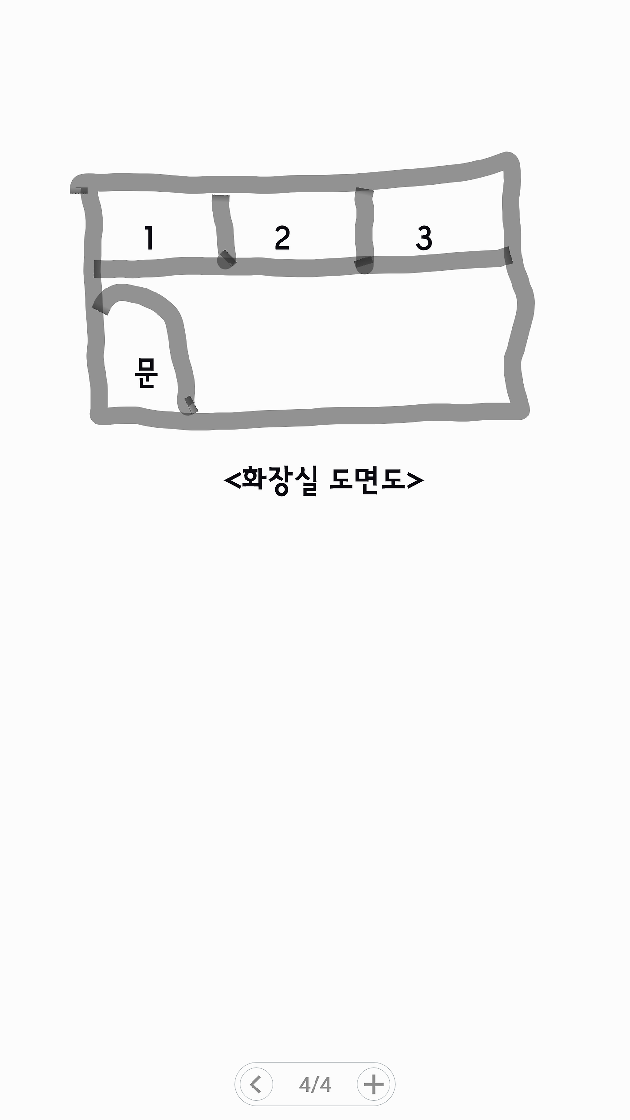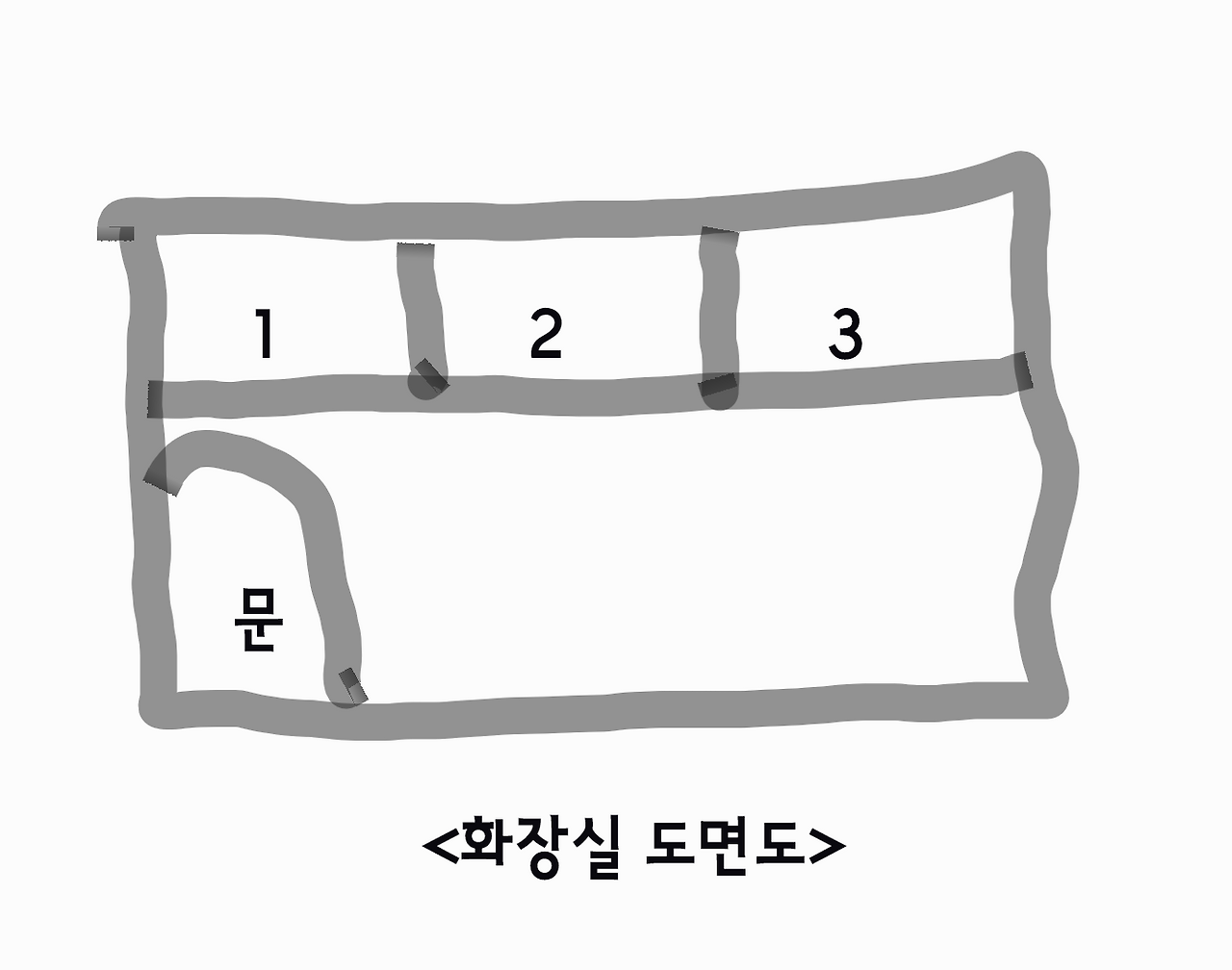 A=네. 문을 기준으로 들어왔을 때 제일 왼쪽 칸이었어요. 화장실 도면도를 보며 설명드리죠. 첫 번째는 1번칸에서 역류했어요. 두 번째는 3번, 세 번째는 2번, 그리고 오늘은 1번칸에서 역류했습니다. 우연찮게도 제가 발견한 것만 그렇습니다.