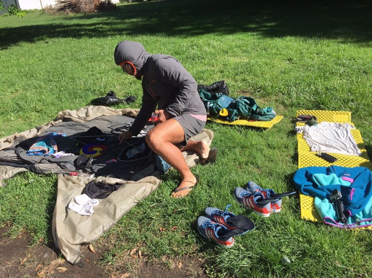 무슨 피난민이 된 것 마냥 짐들을 짊어지고 호텔 마당으로 이동하였다. 우리 방은 건물 뒷편에 위치해서 햇빛도 잘 들지않고 습기가 잘 차는 방인듯 했다. 게다가 어제 우리가 들고 온 짐들은 모두 비에 홀딱 젖어있어 건조를 위해 밤새 걸어두어도 여전히 눅눅했다. 가장 심각한 것은 오빠의 침낭과 우리의 배낭. 마치 yard sale을 하듯이 우리의 짐들을 호텔마당에 늘어놓고 말렸다. 구름한점 없이 맑은 날씨에 우리 짐들은 금새 보송보송해졌다.