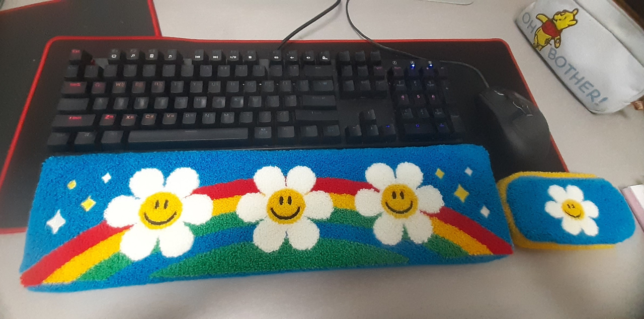 짜잔! 따스한 햇살 같은 언니에게 하얀 구름 조각 같은 블라우스를 선물 받았어요. 보들보들한 촉감에 폭 안기니 마음이 솜사탕처럼 달콤해졌어요. 게다가 파란 하늘과 알록달록 무지개가 그려진 키보드랑 마우스 손목 보호대까지! 보송한 촉감이 손목을 포근하게 감싸주는데, 꼭 예쁜 꿈을 꾸는 기분이에요.
