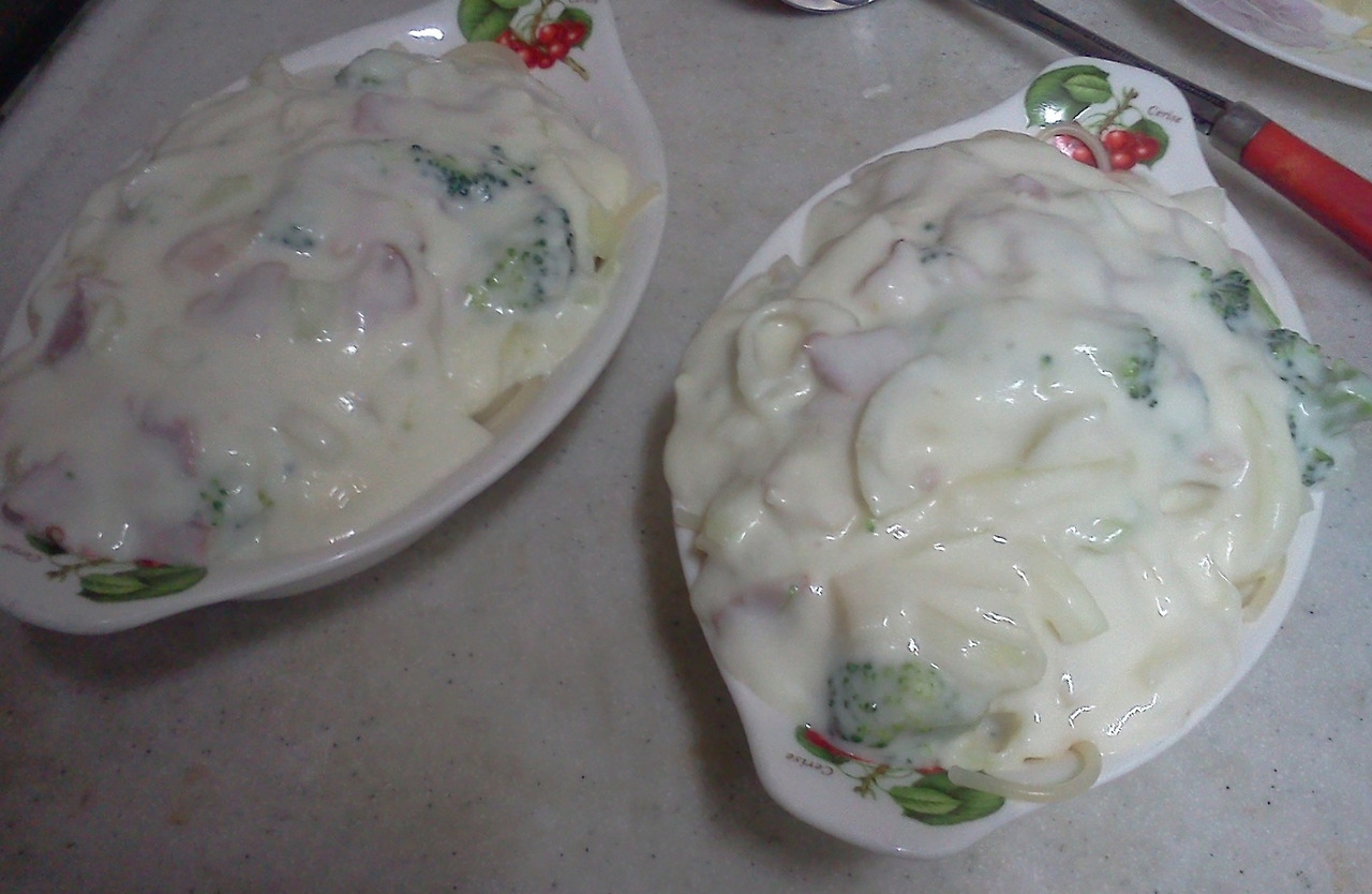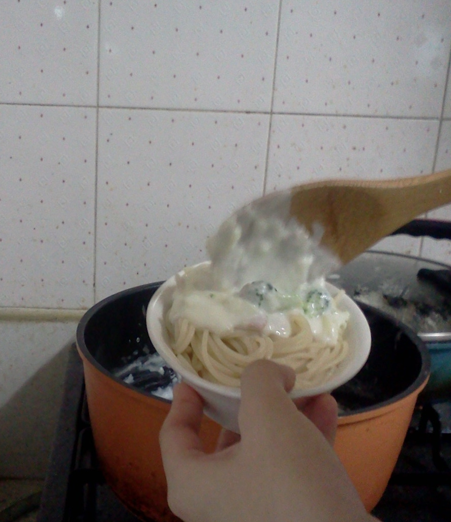 떨리는 손으로 밀가루와 버터를 달달 볶은 White Roux(화이트루)에 우유를 부어 크림소스를 완성했다. 아참, 베이컨도 넣고 비장의 무기인 집에 방치되어 있던 브로콜리도 넣었다.(엇 너무 크게 썰었나? 에라 모르겠다.)