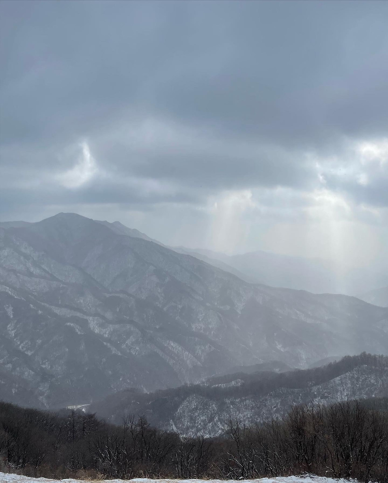 특이하게도 마른 잎이 떨어지기도 전에 눈이 내렸는지 연 노란 마른 잎에 흰 눈이 내려앉은 모습이 저의 시선을 끌었습니다. 겨울 설산을 더욱 따뜻하게 만들어 주었습니다.