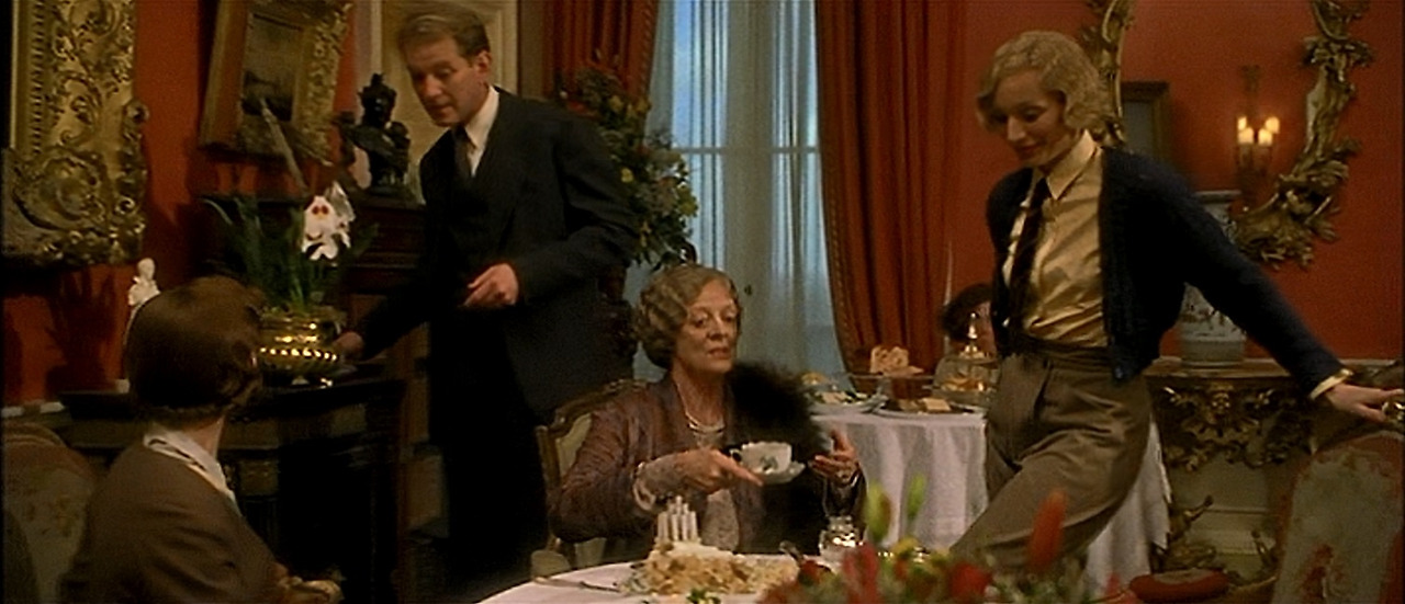 예전에 애프터눈 티를 다룬 글에서도 쓴 적이 있지만 이때의 주제는 주로 날씨, 주변의 사람들 뒷담화, 돈 문제, 혹은 새로 뽑은 하녀나 하인 이야기 등이었다. 성격 나쁜 귀족 할머니 전문 배우인지 의심될 정도로 이런 캐릭터가 잘 어울리는 매기 스미스는 여기서도 위선적이고 냉담한 트랜섬 백작부인을 연기하고 있는데, 그녀는 새롭게 뽑은 하녀가 '경험이 별로 없는 어린 여자애라서 급료를 적게 주고 쓰고 있다'며 넌지시, 자랑하기도 한다.