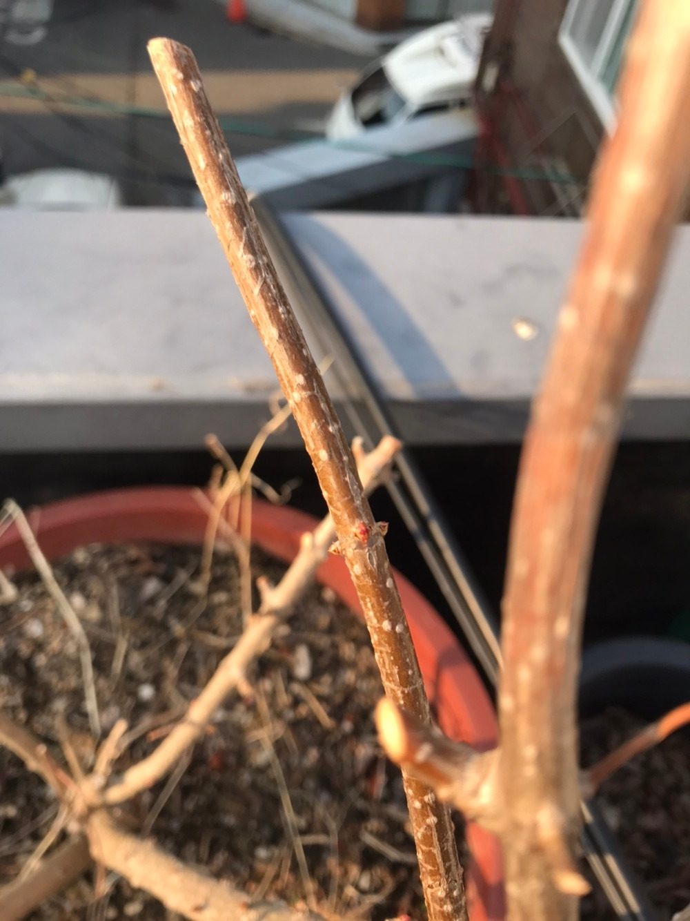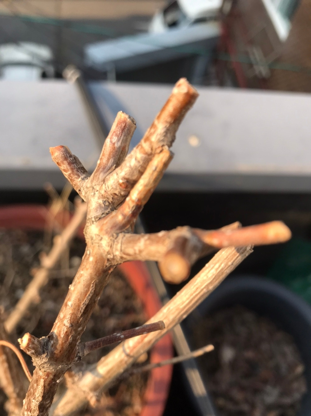 메인 가지에서도 일부 가지는 쳐 줘야 하는데, 새 눈이 올라올 수 있는 부분을 남기고 잘라야 한다. 나무 가지 모양의 관리를 위해 아예 그 잔가지를 없앨 요량이 아니라면 말이다. 보통 자른 부분 바로 아래 쪽의 새 눈에서 새 가지가 자라기 마련이다. 그러면서 쭉 곧기만 했던 가지 옆으로 퍼져 나가는 방식으로 모양이 만들어진다. 그런데 새 눈 부분을 남겨두지 않고 바짝 잘라버리면 더 이상 새 가지가 나오지 않는 경우가 많았다. 물론 거기서도 새 가지가 날 수 있겠지! 빼앗긴 들에도 봄은 오나니