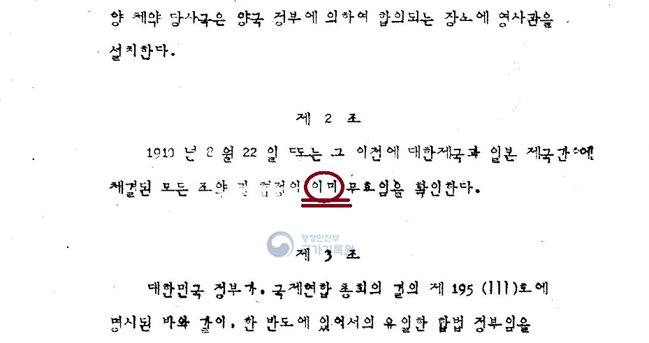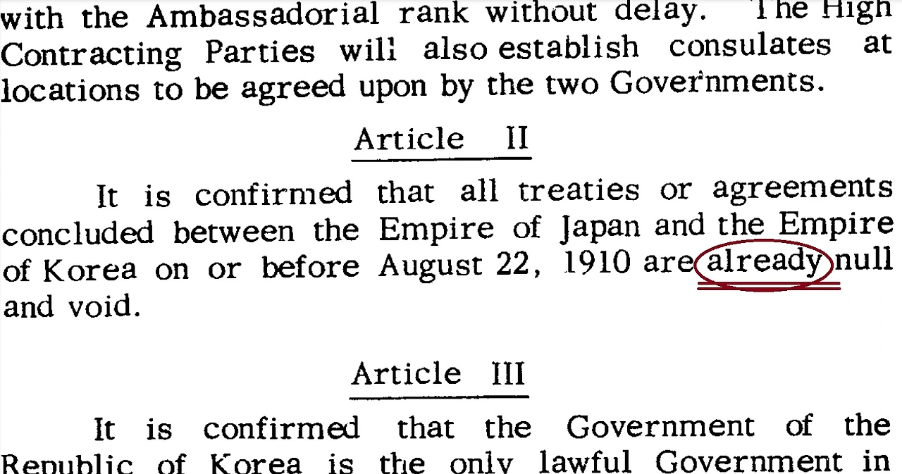 "It is confirmed that all treaties and agreements concluded between the Empire of Korea and the Empire of Japan on or before August 22, 1910 arealready null and void. (1910년 8월 22일 및 그 이전에 대한제국과 대일본제국 간에 체결된 모든 조약 및 협정이 이미 무효임을 확인한다.)"