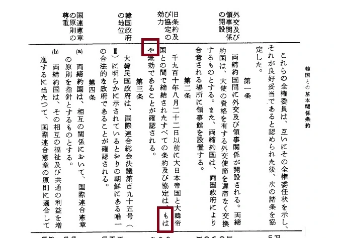 일본어로 번역된 '한일기본관계조약'의 2조. 빨간 상자 안에 'already'를 일본어로 번역한 'もはや (모하야)'가 적혀있다. - 외무성 자료 참고
