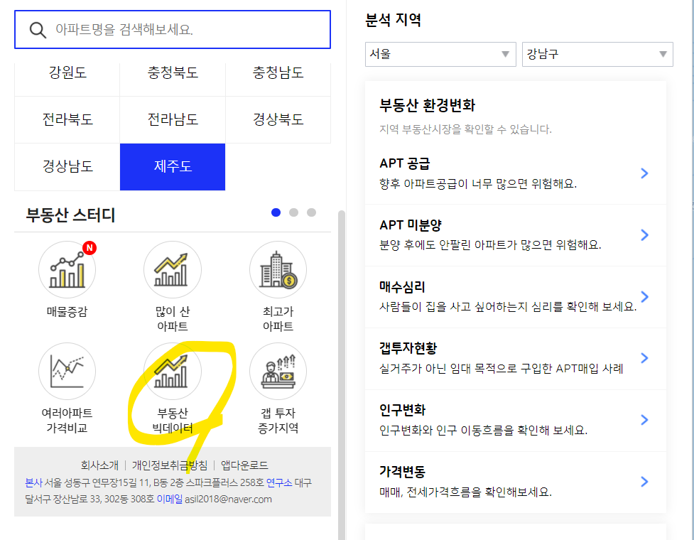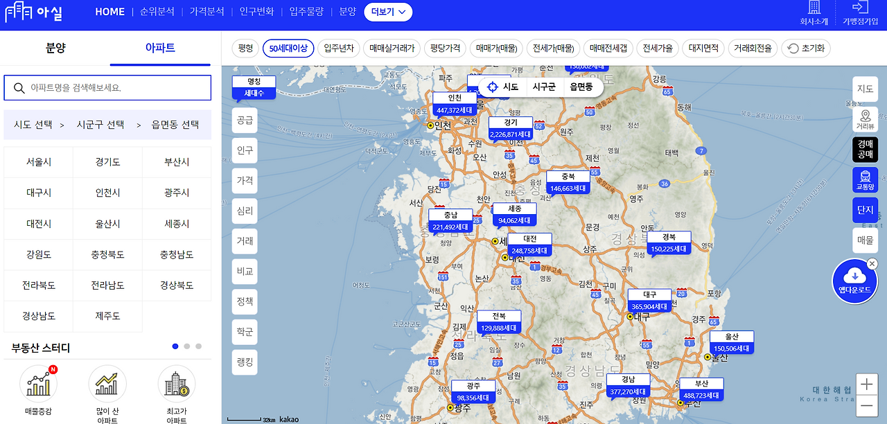 부동산 빅데이터를 손쉽게 보여준다. 공급, 미분양, 인구, 가격변동 뿐만 아니라 갭투자현황, 매수심리까지 데이터로 볼 수 있다.