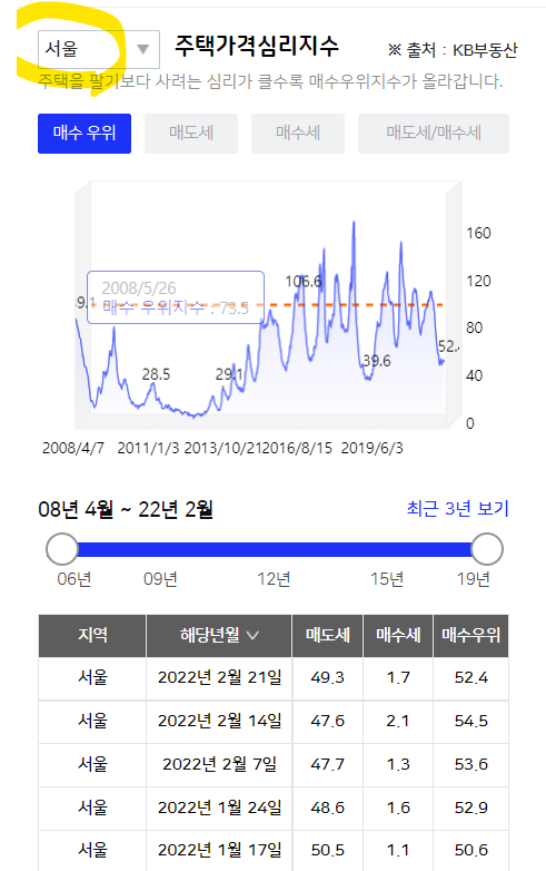 그리고 오른쪽 사진은 서울의 매수심리 그래프다. 1월부터 소폭상승하다 다시 하락으로 돌아선 것으로 확인된다.