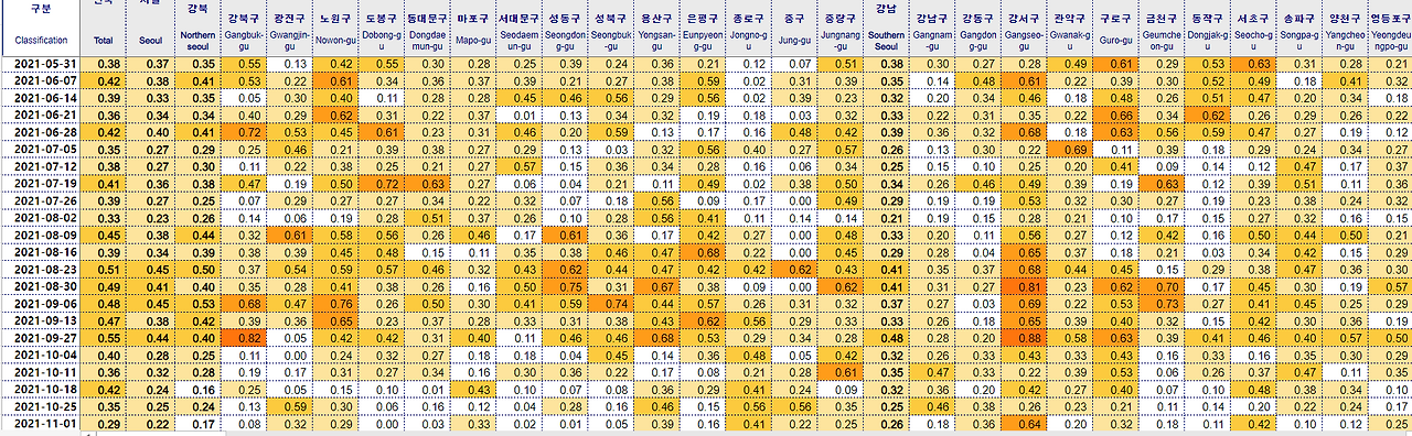 서울 2019년 12월 30일 지수 103.297 , 2020년 10월 5일 지수 112.862