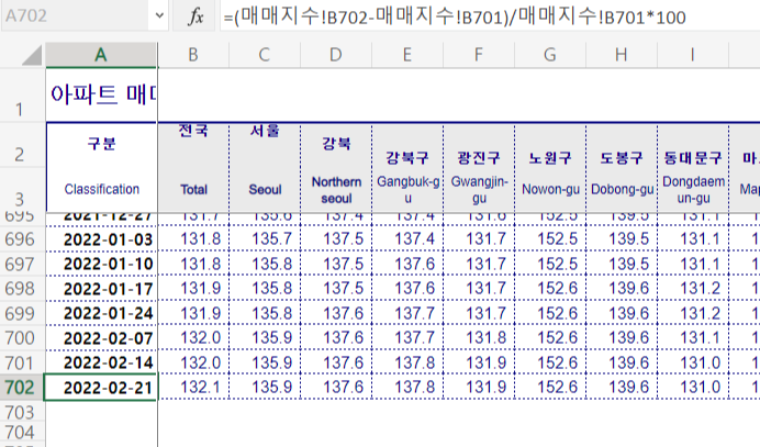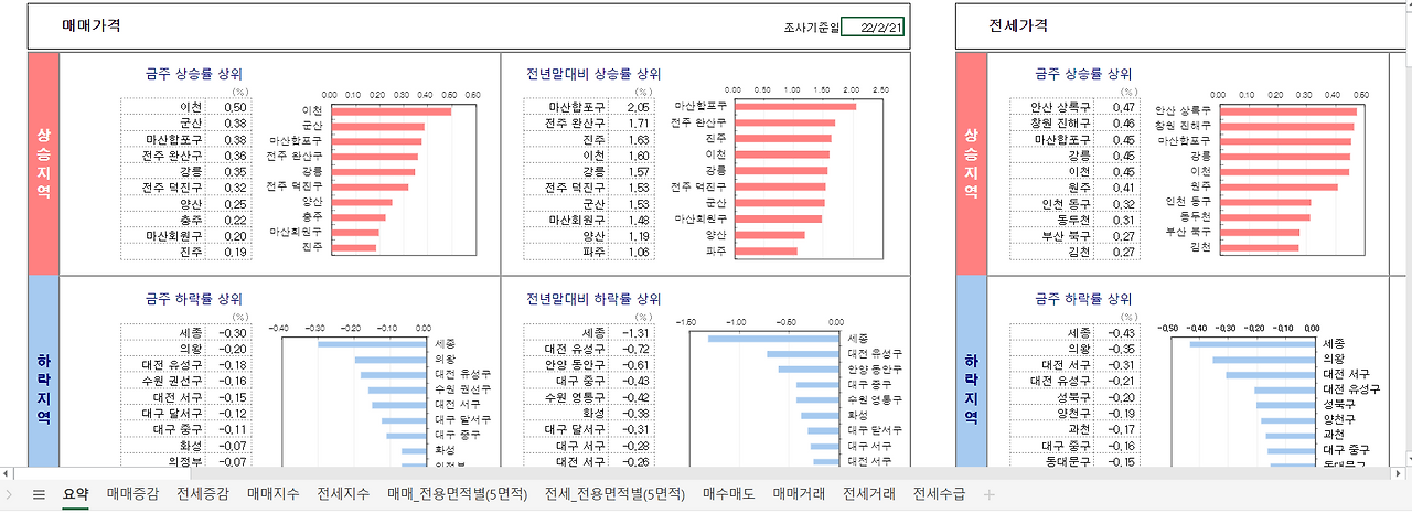 Sheet를 나뉘어 매매증감, 지수, 전세증감, 지수 등 파악 가능.
