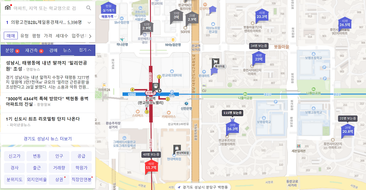 꽤 유명한 어플. 왼쪽 하단에 보면 외지인비율에 직장인연봉까지 알려준다. 검색도 매매형태/세대수/유형/입주년차/건폐율/갭가격/월세수익률/임대사업률/용적률/주차공간 등 엄청 섬세하게 나눠볼 수 있어서 이용하기 좋다.
