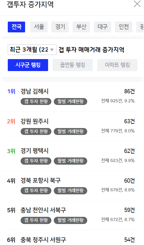왼쪽 사진을 보면 1채 이상 투자자들이 공시지가 1억미만 아파트로 갭투자가 몰리다보니 지방소도시에 갭투자가 증가하는 것으로 보인다. 원주는 최근에 나도 관심이 있어서 손품 팔아본 지역인데.. 하락하고 있는 다른 지역에 비해 거래건수나 가격이 이전수준을 지켜내고 있는 것 같다. 소자본으로 두드려볼만한 곳이 이런 소도시들인데.. 이런 곳부터 가장 먼저 하락할 것 같은 두려움도 있다.