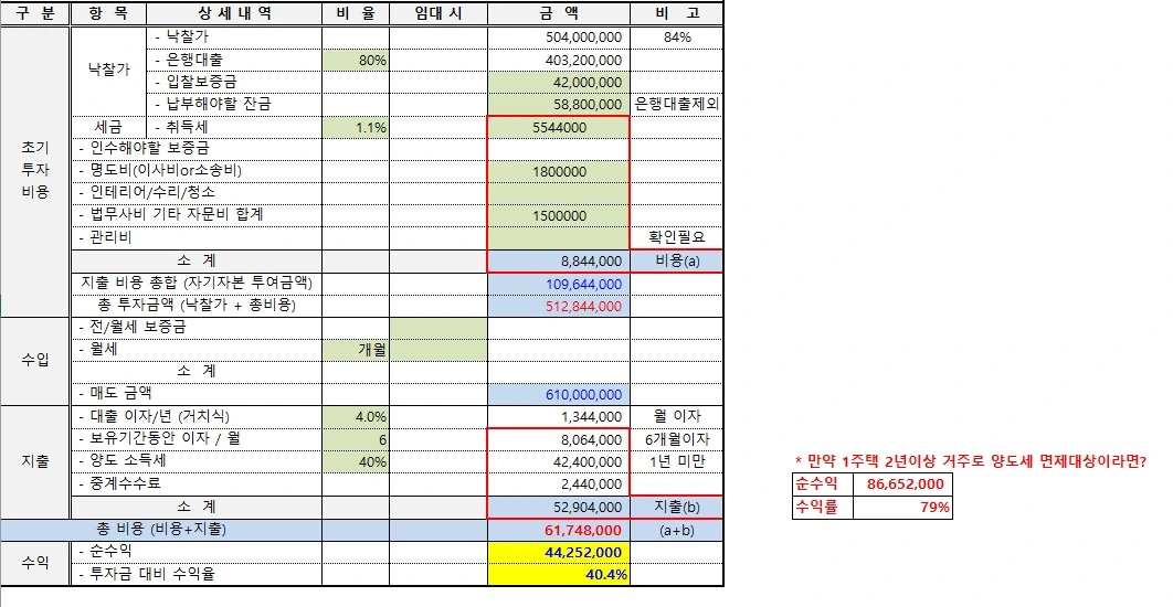 1 주택 2년 이상 거주로 양도세 면제대상이라면 크게 수익률이 오르겠지만,