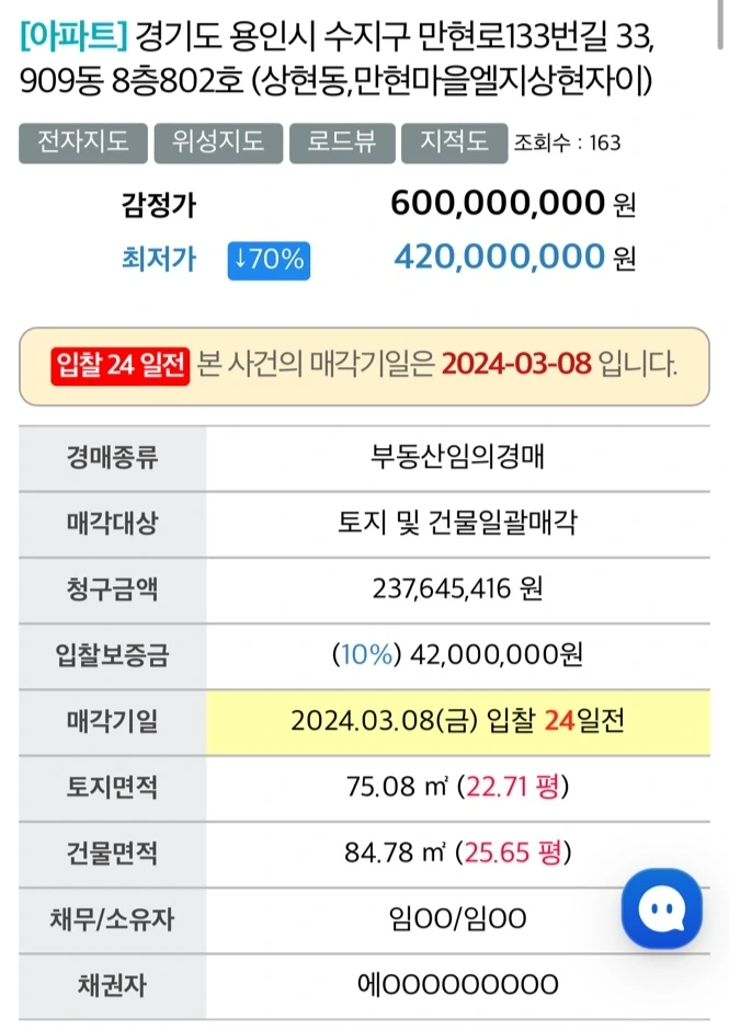 1회 유찰로 4.2억에 나와있는데 최근 수지에서 낙찰된 사례들을 보면 5억 초 중반까지 낙찰가격이 가지 않을까 생각된다.