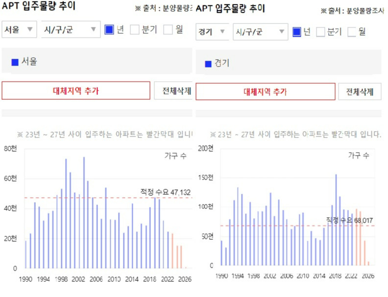 미분양은 추세, 규모가 모두 중요하다. 역사적으로 15,000호 이상의 구간이 하락장인 2008~2017년 구간인데, 이때 집을 샀으면 현재 기준 평균적으로 48,913만 원(13.4월 기준 평균 아파트 매매가격)에서 120,972만 원(23.3월 기준)으로 3배 가까운 자산의 증식을 일으킬 수 있었다. 미분양의 추세와 규모를 보면서 함께 앞으로의 공급률도 함께 봐야 한다. 서울기준으로 입주 적정 수요는 47,132호인데 향후 공급량은 그에 많이 미치지 못하고 있다. 경기도 기준으로는 적정수요 68,017호를 23,24년도는 충족시킬 수 있으나 25년도부터는 미치지 못할 것으로 예상된다.