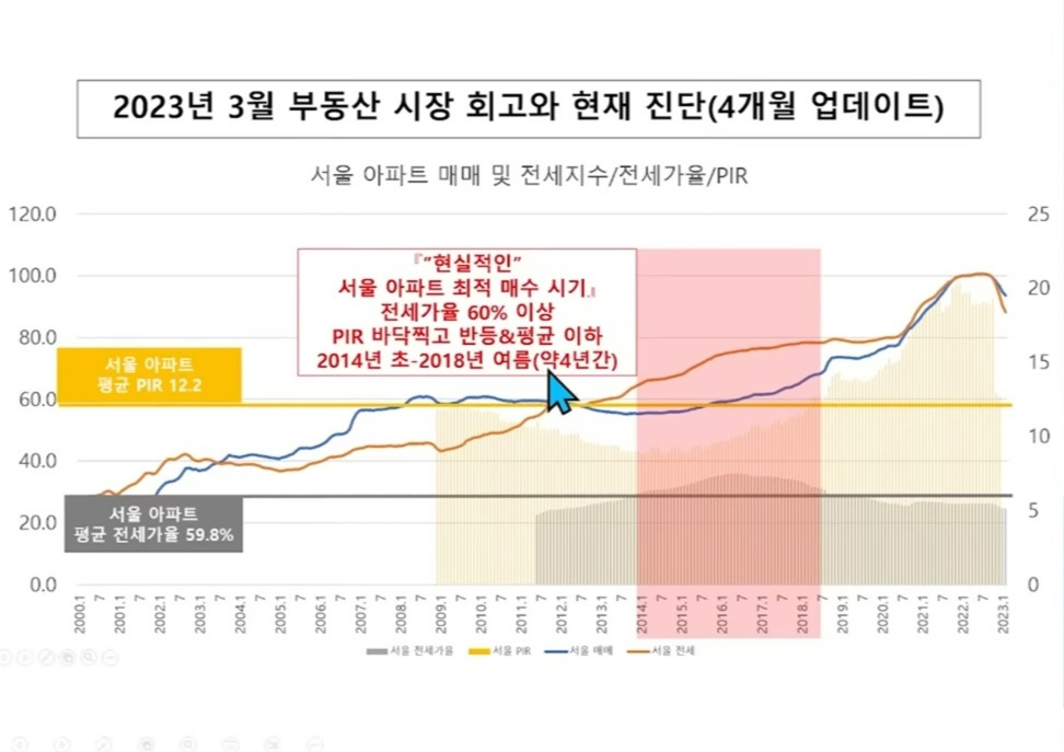 즐겨보는 월급쟁이부자들 유튜브를 보면 전세가율 60% 이상+pir 바닥 찍고 반등 또는 평균 이하 일 때를 서울 아파트 최적매수시기로 보고 있다.
