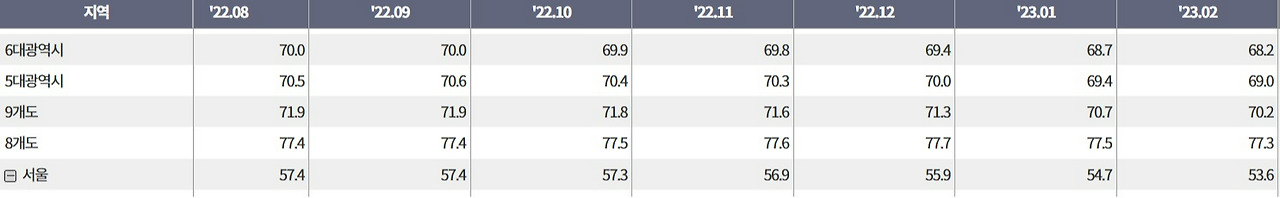 그렇다면 현재 서울 기준 평균 전세가율은 어떻게 될까?