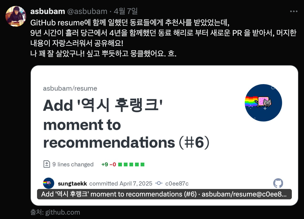 이렇게 하루 이틀 텀으로 GitHub 추천사 PR이 왔다는 메일을 받다 보니 감동하지 않을 수 있나!!! ㅠ_ㅠ