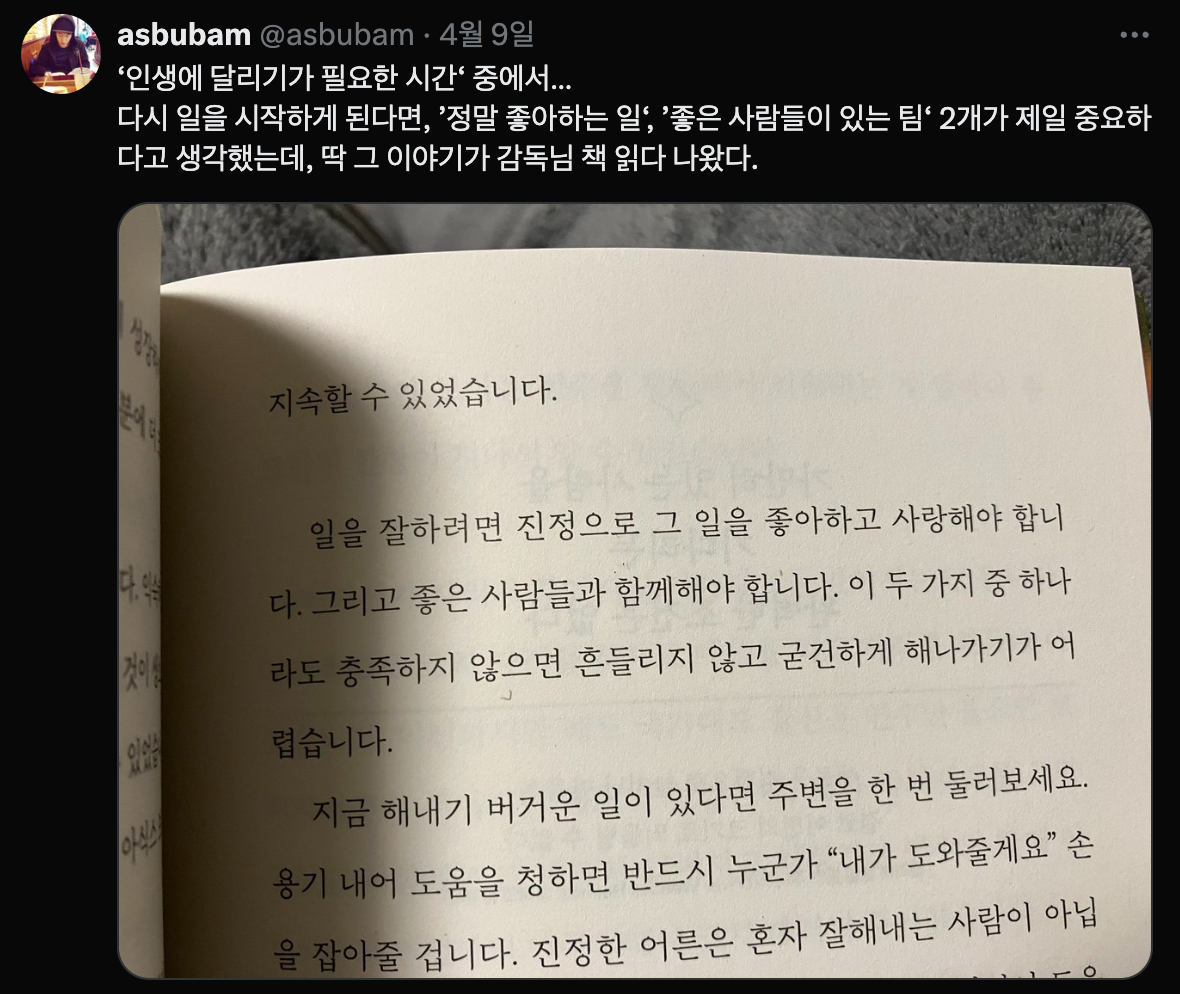 감독님이 쓰신 책 인생에 달리기가 필요한 시간 을읽고 있는데, 꼭 달리기 뿐만이 아니라 인생에 대해서, 일에 대해서도 한번 더 생각해 보게 되는 내용이 많다.