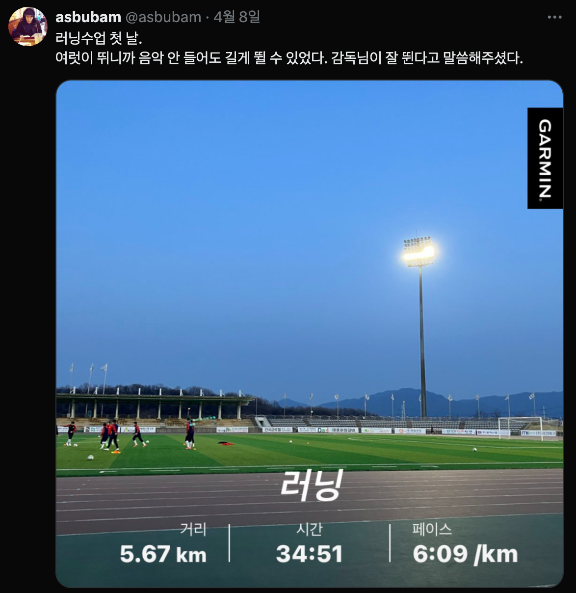 매 번 혼자 왕숙천을 뛰다가, 체육관 트랙에서 여러 사람들이랑 줄지어서 발맞춰 뛰다 보니 좀 더 힘이나기도 하고, 아직 달리면서 파이팅! 하고 외치는 건 좀 부끄럽고 어렵... 지만 언젠가 나도 같이 더 크게 소리칠 수 있겠지? :)