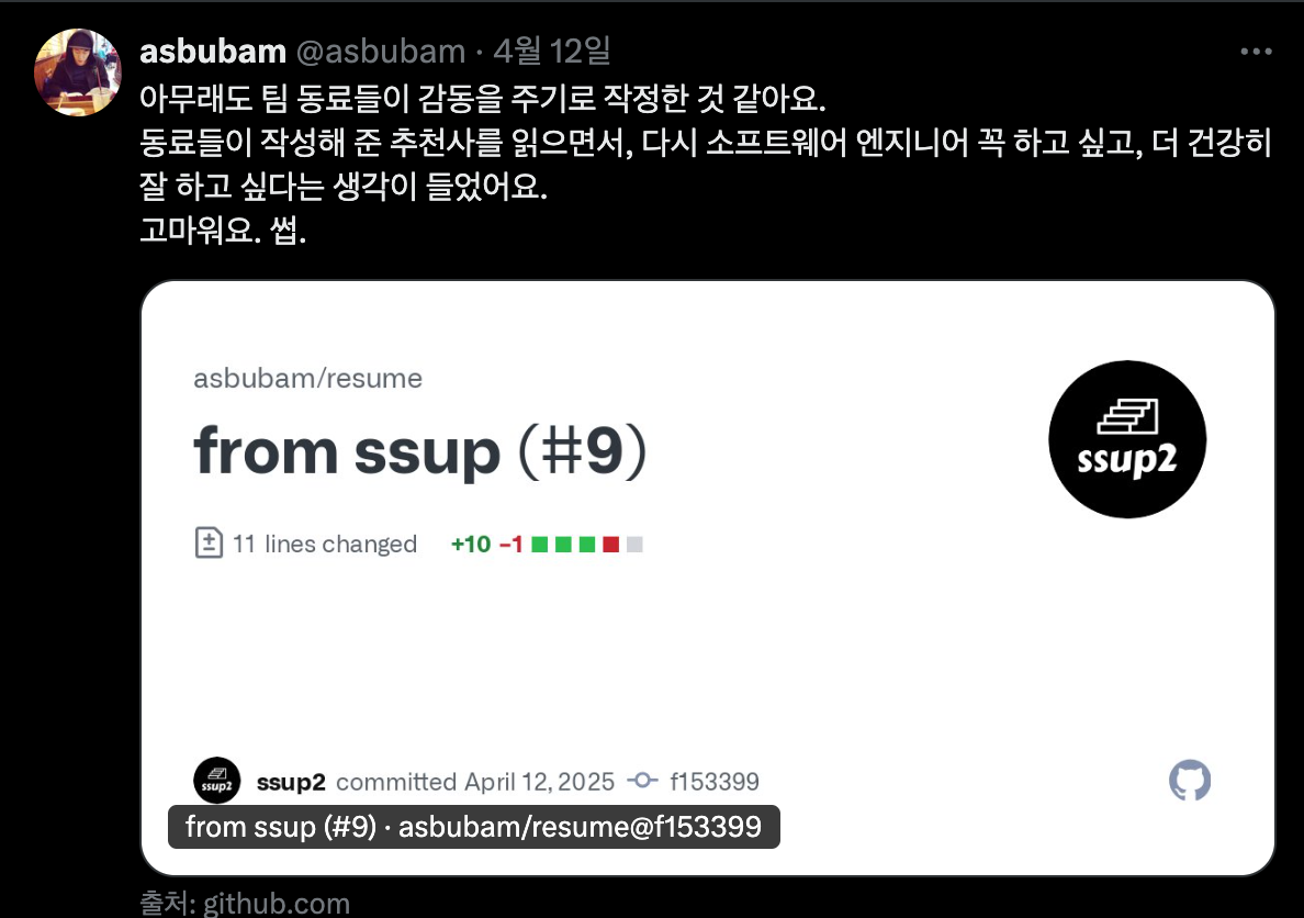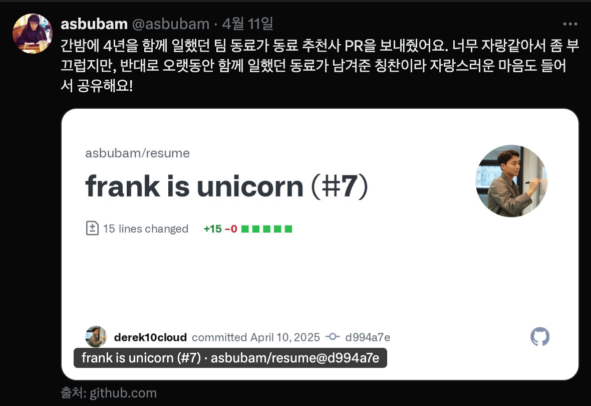 퇴사 2주 차 어느 날 저녁을 시작으로 네 명의 동료들로부터 하루 이틀 텀으로 추천사 PR을 주르륵 받았다.