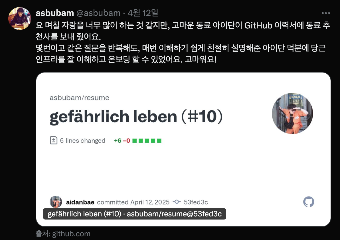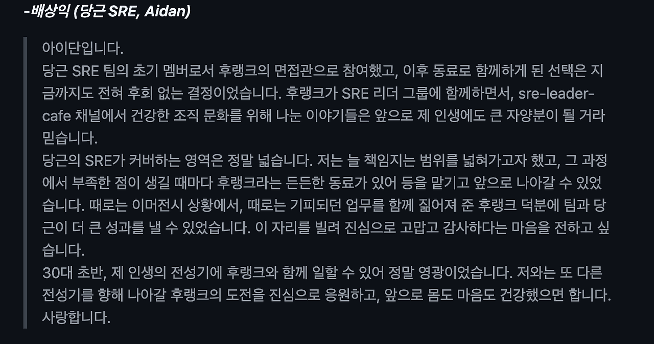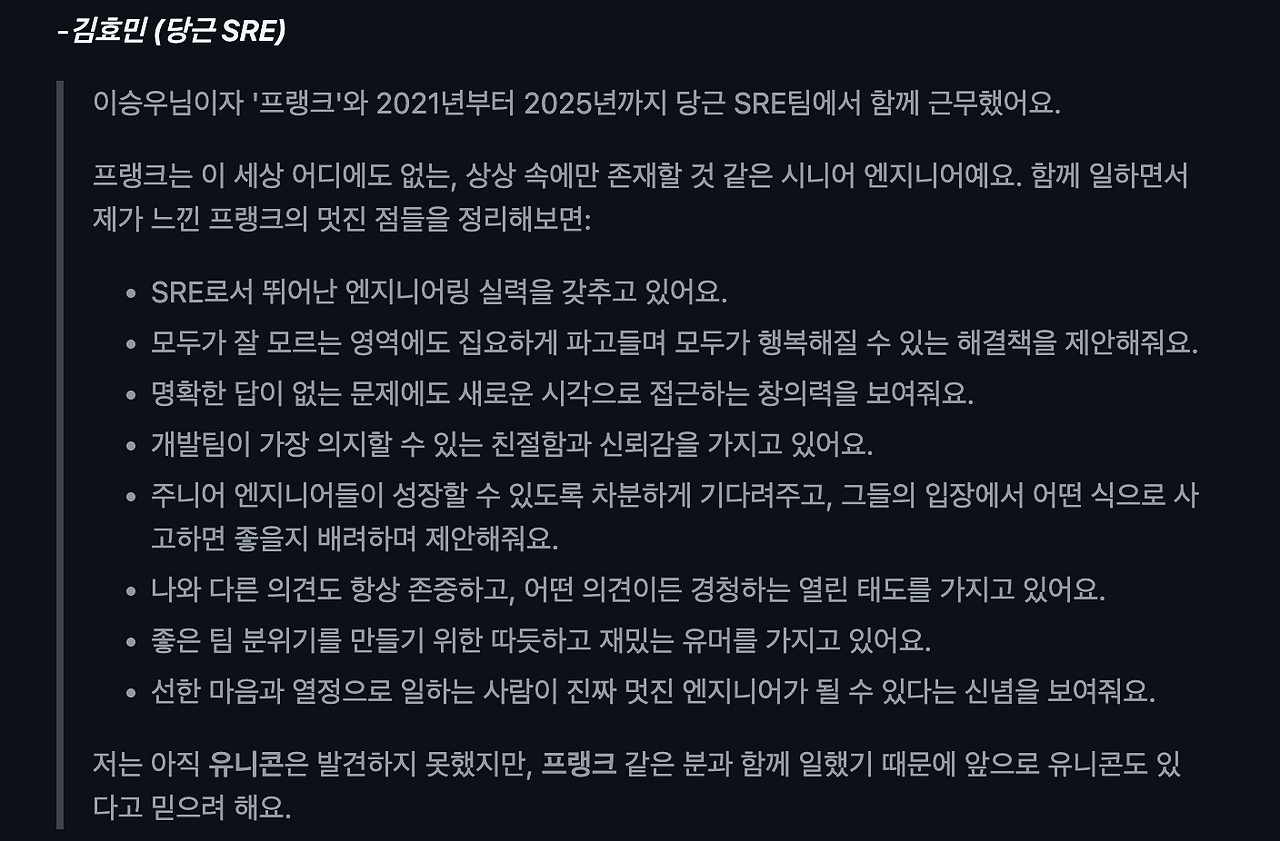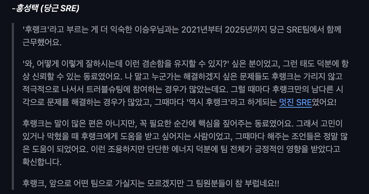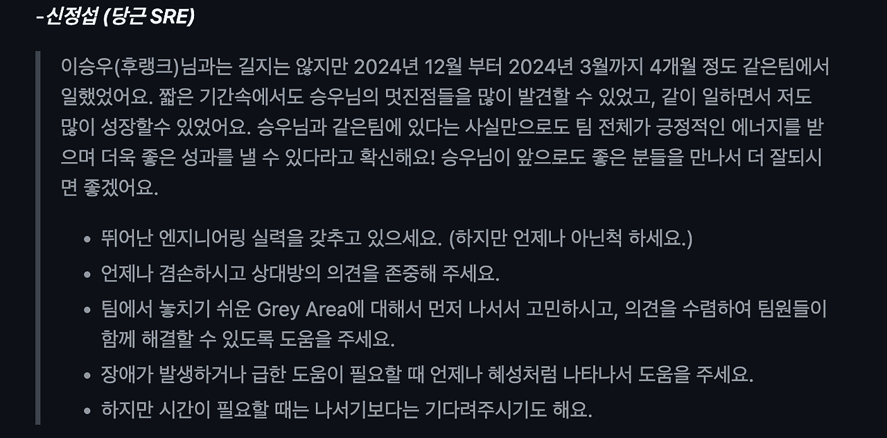 지난 일기를 업로드하고, 한 주 동안 있었던 일 중 가장 자랑(?)하고 싶은 일은, 함께 일했던 SRE팀 동료들이 깜짝 추천사 PR을 주르륵 보내 준 것이다.