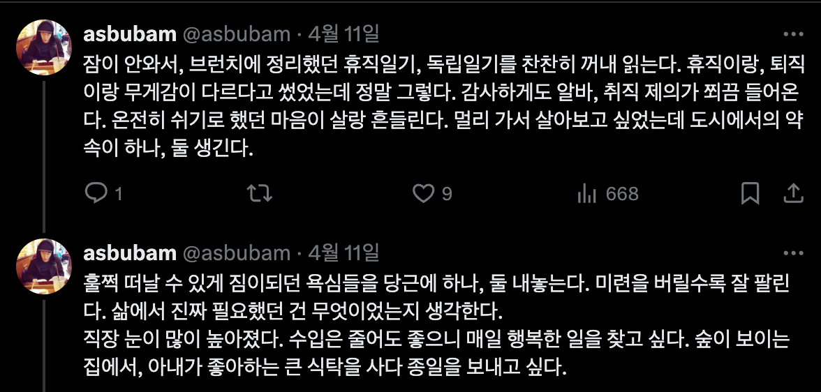 그리고, 생각보다 휴직일기, 독립일기를 나 스스로 읽어보면서 느끼게 되는 것, 뒤늦게 깨닫게 되는 것도 많다.