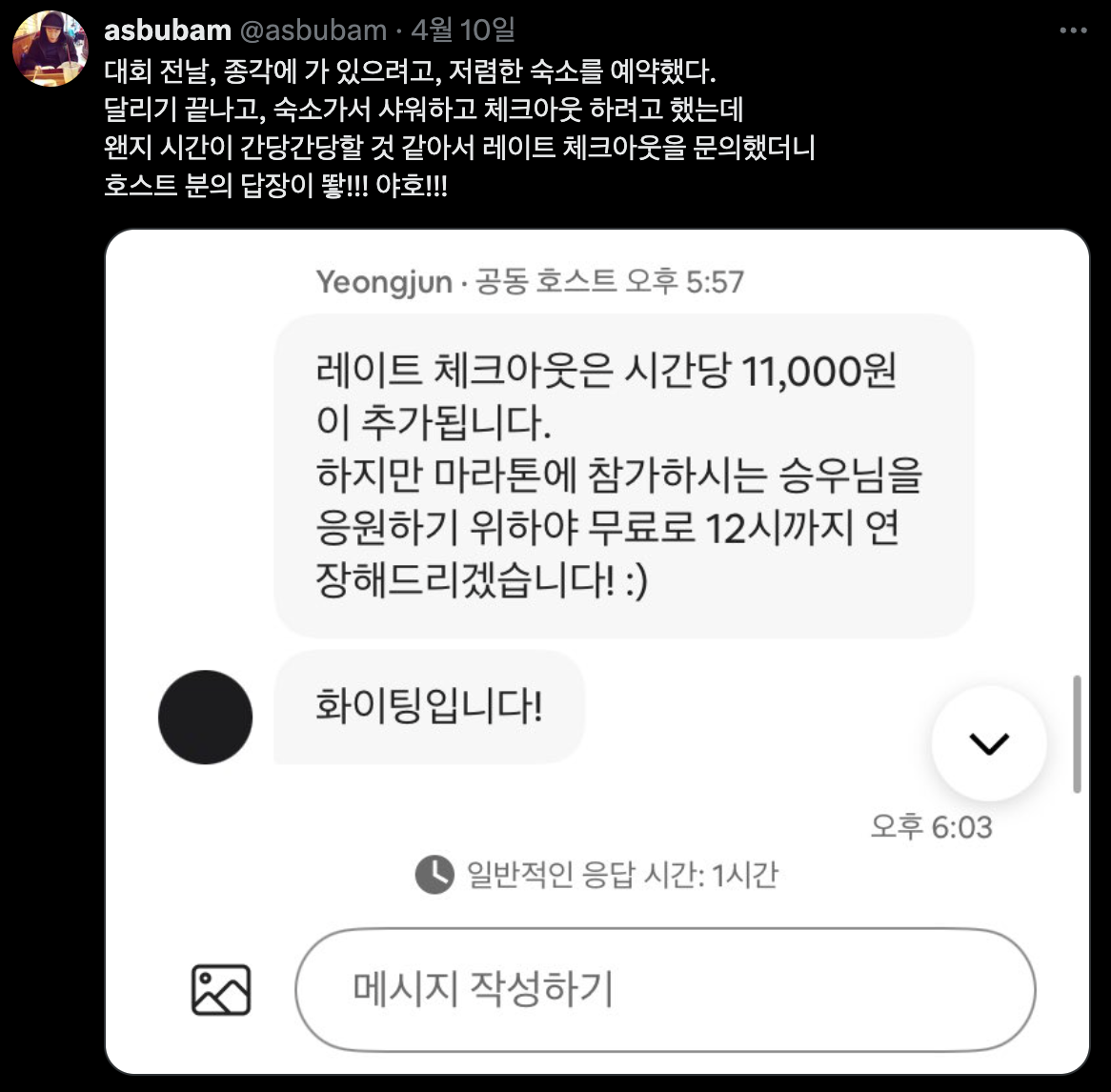 메시지 스샷처럼, 종각에서 바로 자고 대회 출발하려고 예약했던 숙소 호스트 분이, 마라톤 참여한다고 하니 레이트 체크아웃을 무료로 연장해 주셔서, 역시 되는 사람은 된다. 가 아니라, 기분 좋게 대회를 맞이할 수 있었다. 역시 망설이기보다, 물어보길 잘했다고 생각했다.