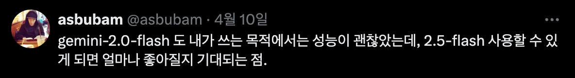 트윗했던 것처럼 2.0-flash도 꽤 만족하고 있어서, 2.5-flash 성능도 기대된다.