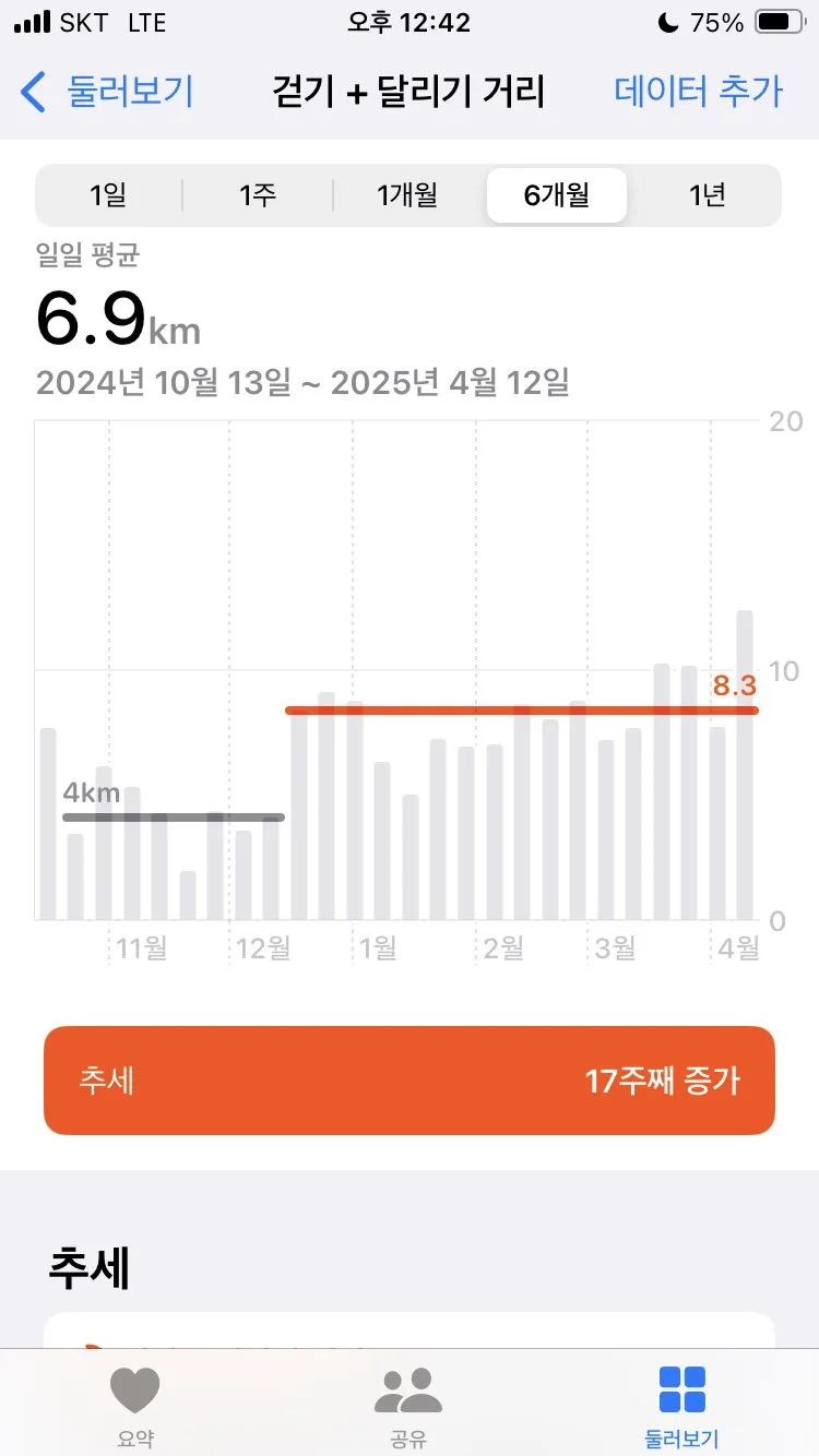 어제, 갑자기 알람이 와서 알게 됐는데, 작년 12월 14일 달리기 시작한 이후로 걷기+달리기 거리 메트릭이 쭉 올랐고, 이 시점부터 공황장애, 우울증 약도 더 이상 먹지 않게 된 것 같다.