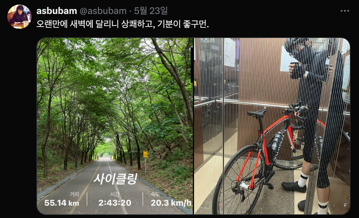 오랜만에 새벽 달리기 너무 좋았어서, 날 좋으면 또 나가서 양수까지 다녀와야지.