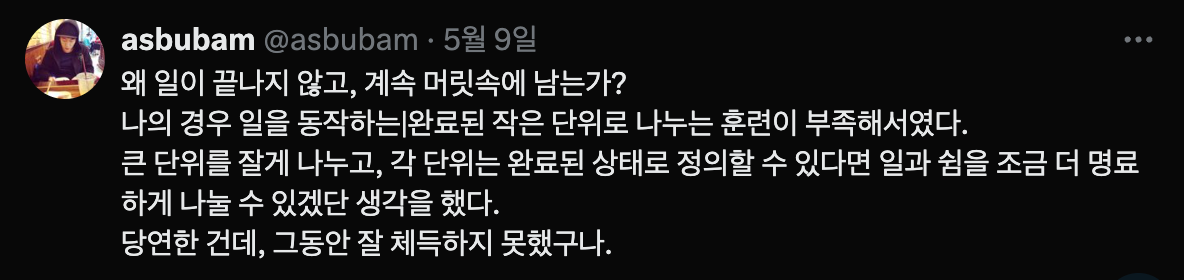 전체 범위를 잘게 나누고, 또 나눠서 스스로 달성감, 완결감을 만들고 가질 필요가 있었다는 생각을 했다.