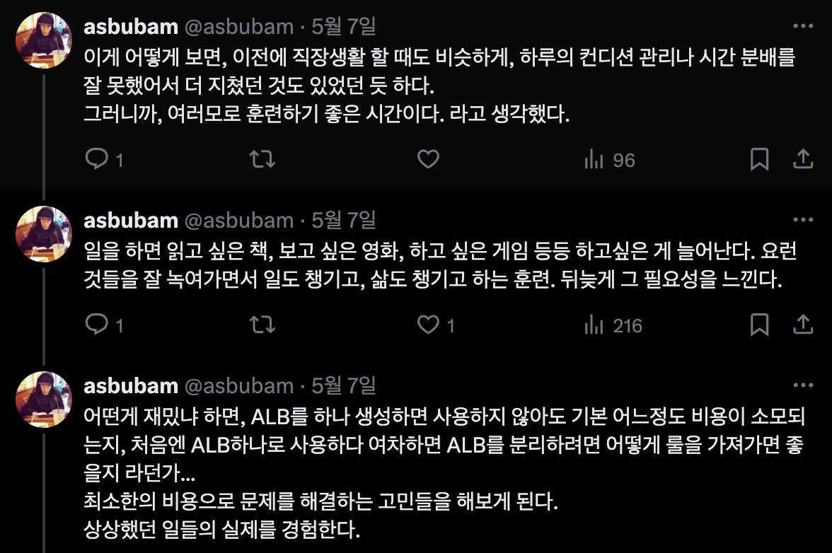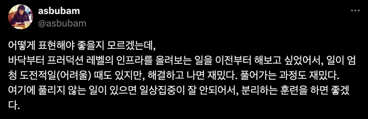 새로운 환경을 프로비저닝 하고 인프라를 쌓아가는 과정이 즐겁고, 공부가 많이 되기도 했고,