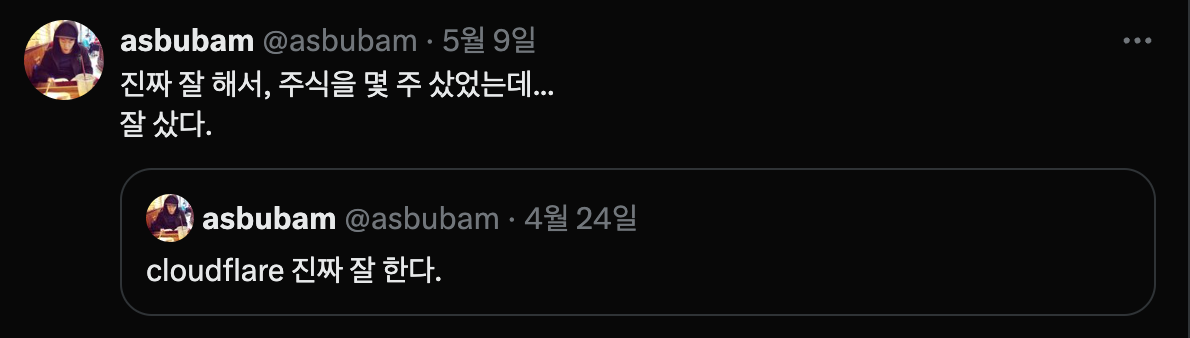 아! 아르바이트하면서, 그동안 써보고 싶었던 클라우드 플레어를 첨 써봤는데, 서비스를 너무 편하고, 직관적으로 잘 만든 거다. 그래서 감동하면서 트윗도 몇 개 올리고, 주식도 몇 주 샀는데, 마침 분기 실적이 엄청 좋아서 주식이 많이 뛰었다. 바로 매도하고, 갖고 싶은 거 몇 개 샀다. 흐흐. :)